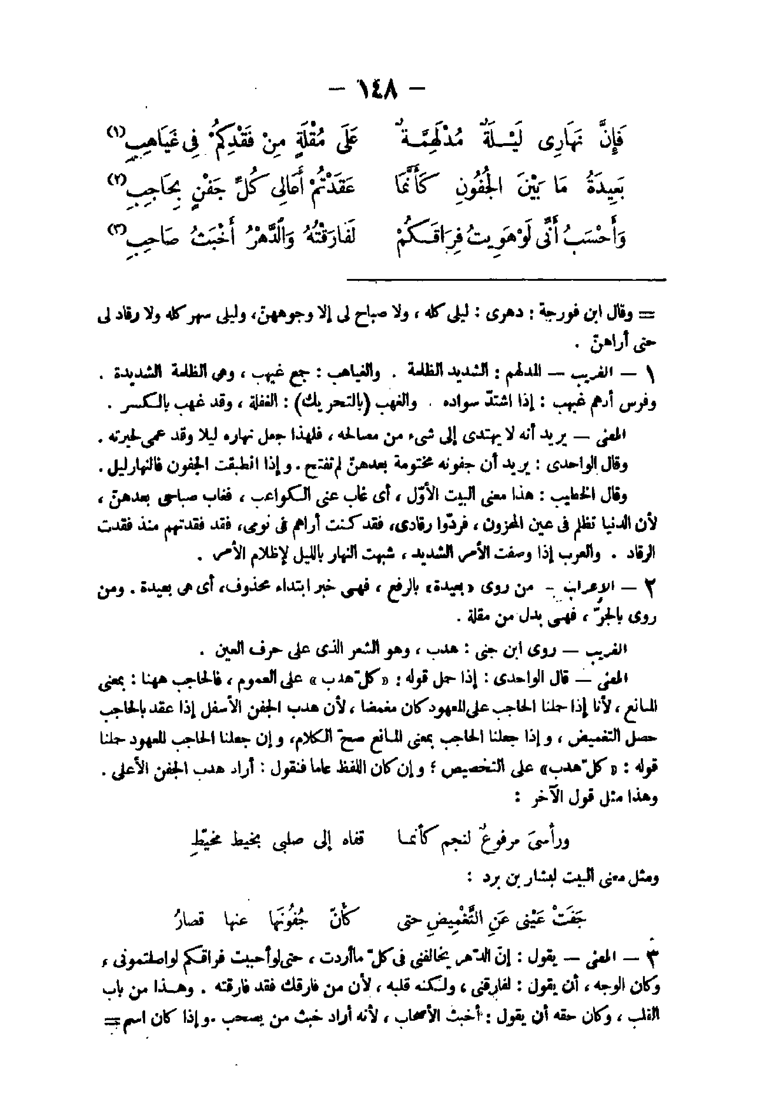 - الْغَرِيب المدلهم الشَّديد الظلمَة والغياهب جمع غيهب وهى الظلمَة الشَّدِيدَة وَفرس أدهم غيهب إِذا اشْتَدَّ سوَاده والغهب بِالتَّحْرِيكِ الْغَفْلَة وَقد غهب بِالْكَسْرِ الْمَعْنى يُرِيد أَنه لَا يهتدى إِلَى شئ من مَصَالِحه فَلهَذَا جعل نَهَاره لَيْلًا وَقد عمى لحيرته وَقَالَ الواحدى يُرِيد أَن جفونه مختومة بعدهن لم تفتح وَإِذا انطبقت الجفون فالنهار ليل وَقَالَ الْخَطِيب هَذَا معنى الْبَيْت الأول أى غَابَ عَنى الكواعب فَغَاب صباحى بعدهن لِأَن الدُّنْيَا تظلم فى عين المحزون فَردُّوا رقادى فقد كنت أَرَاهُم فى نومى فقد فقدتهم مُنْذُ فقدت الرقاد وَالْعرب إِذا وصفت الْأَمر الشَّديد شبهت النَّهَار بِاللَّيْلِ لإظلام الْأَمر