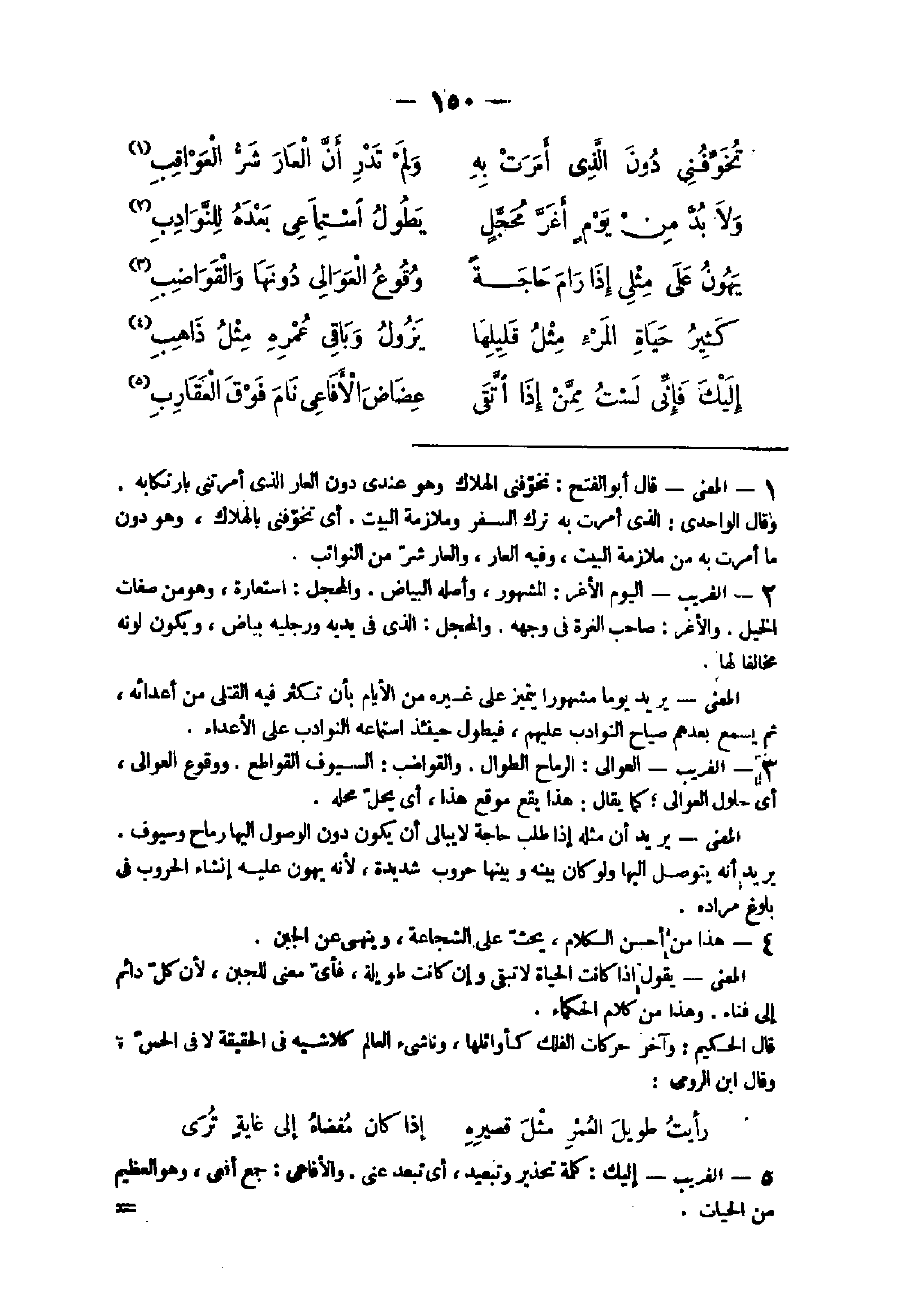 11 - هَذَا من أحسن الْكَلَام يحث على الشجَاعَة وَينْهى عَن الْجُبْن الْمَعْنى يَقُول إِذا كَانَت الْحَيَاة لَا تبقى وَإِن كَانَت طَوِيلَة فأى معنى للجبن لِأَن كل دَائِم إِلَى فنَاء وَهَذَا من كَلَام الْحُكَمَاء قَالَ الْحَكِيم وَآخر حركات الْفلك كأوائلها وناشئ الْعَالم كلاشيه فى الْحَقِيقَة لافى الْحس وَقَالَ ابْن الرومى