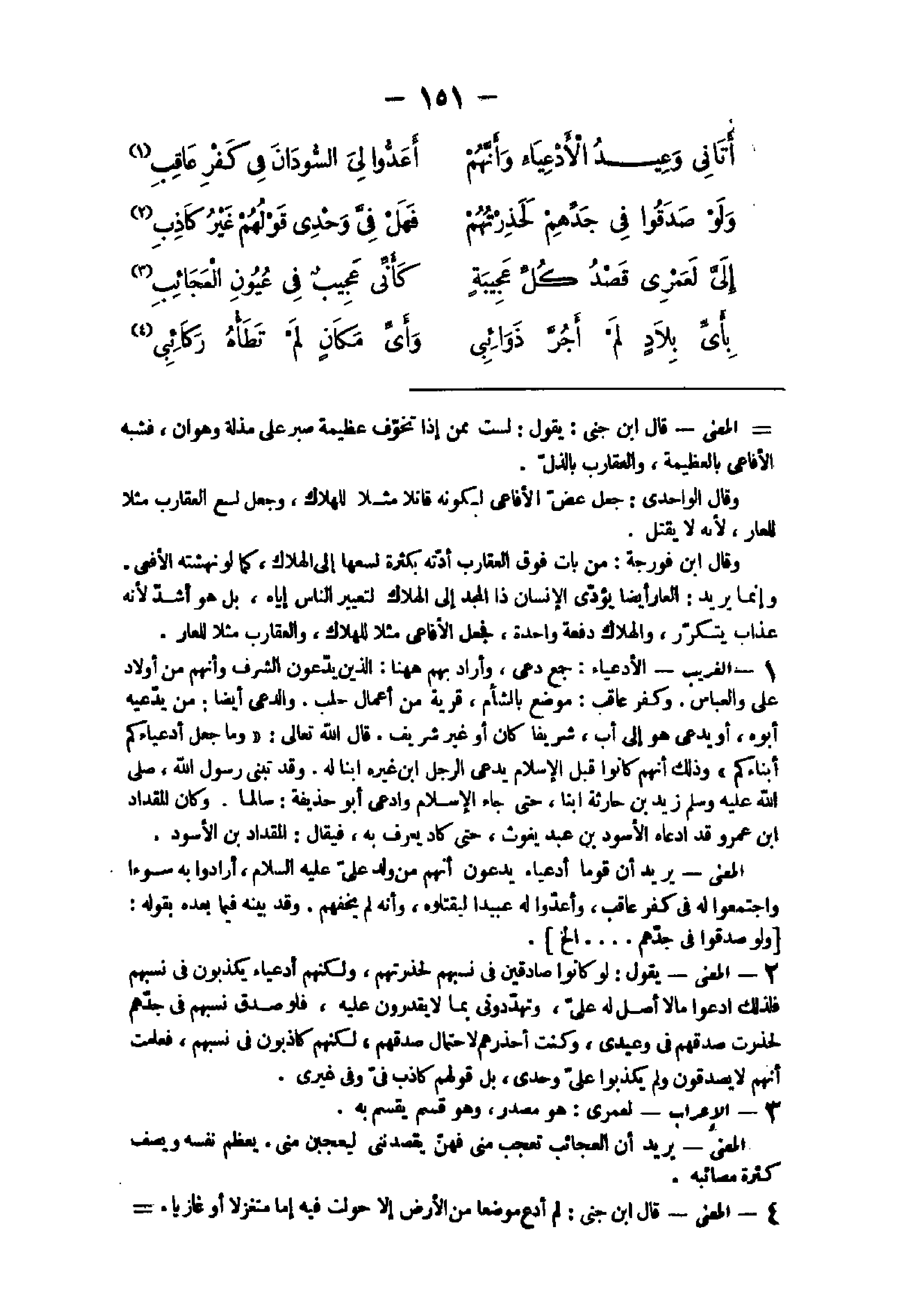 زيد بن حَارِثَة ابْنا حَتَّى جَاءَ الْإِسْلَام وَادّعى أَبُو حُذَيْفَة سالما وَكَانَ الْمِقْدَاد بن عَمْرو قد ادَّعَاهُ الْأسود بن عبد يَغُوث حَتَّى كَاد يعرف بِهِ فَيُقَال الْمِقْدَاد بن الْأسود الْمَعْنى يُرِيد ان قوما أدعياء يدعونَ أَنهم من ولد على عَلَيْهِ السَّلَام أَرَادوا بِهِ سوءا واجتمعوا لَهُ فى كفر عاقب وَأَعدُّوا لَهُ عبيدا ليقتلوه وَأَنه لم يخفهم وَقد بَينه فِيمَا بعده بقوله {وَلَو صدقُوا فى جدهم ... الخ ... }