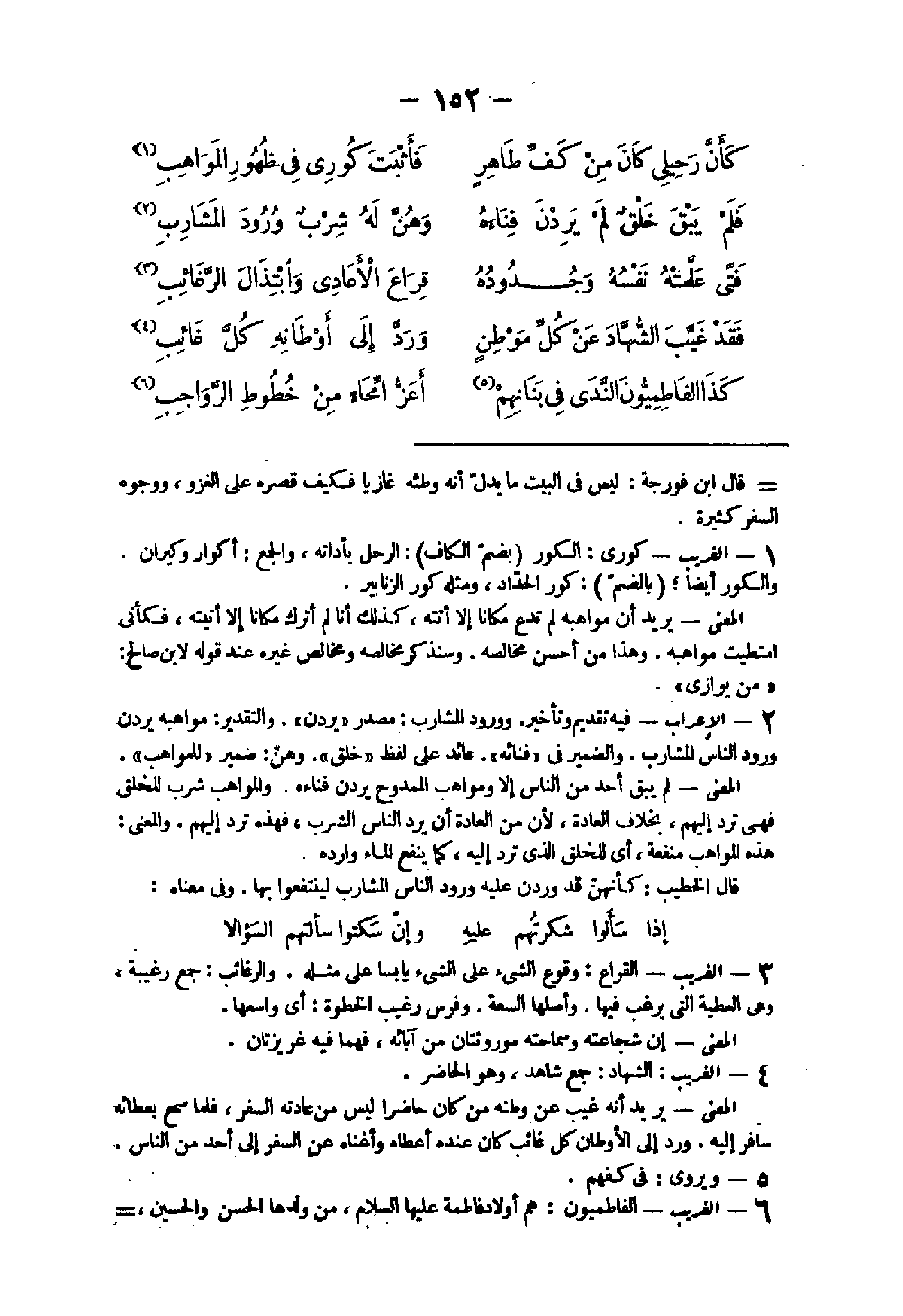 20 - الْغَرِيب الشهاد جمع شَاهد وَهُوَ الْحَاضِر الْمَعْنى يُرِيد أَنه غيب عَن وَطنه من كَانَ حَاضرا لَيْسَ من عَادَته السّفر فَلَمَّا سمع بعطائه سَافر إِلَيْهِ ورد إِلَى الأوطان كل غَائِب كَانَ عِنْده أعطَاهُ وأغناه عَن السّفر إِلَى أحد من النَّاس