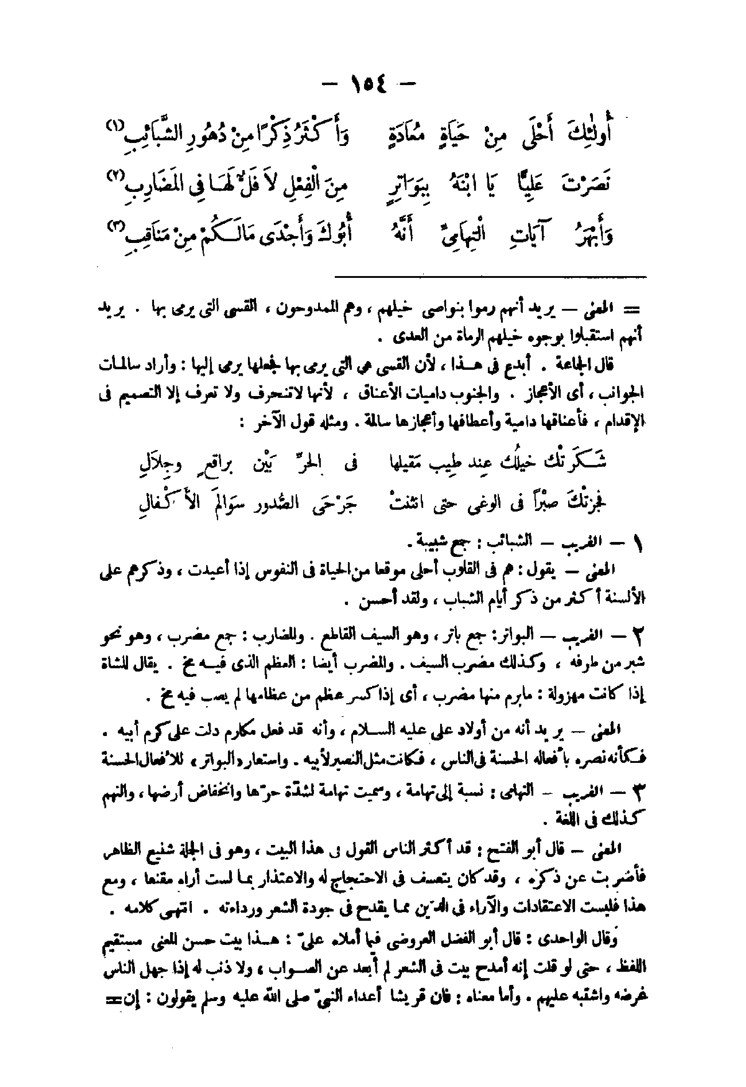 - الْغَرِيب الشبائب جمع شبيبة الْمَعْنى يَقُول هم فى الْقُلُوب أحلى موقعا من الْحَيَاة فى النُّفُوس إِذا أُعِيدَت وَذكرهمْ على الْأَلْسِنَة أَكثر من ذكر أَيَّام الشَّبَاب وَلَقَد أحسن