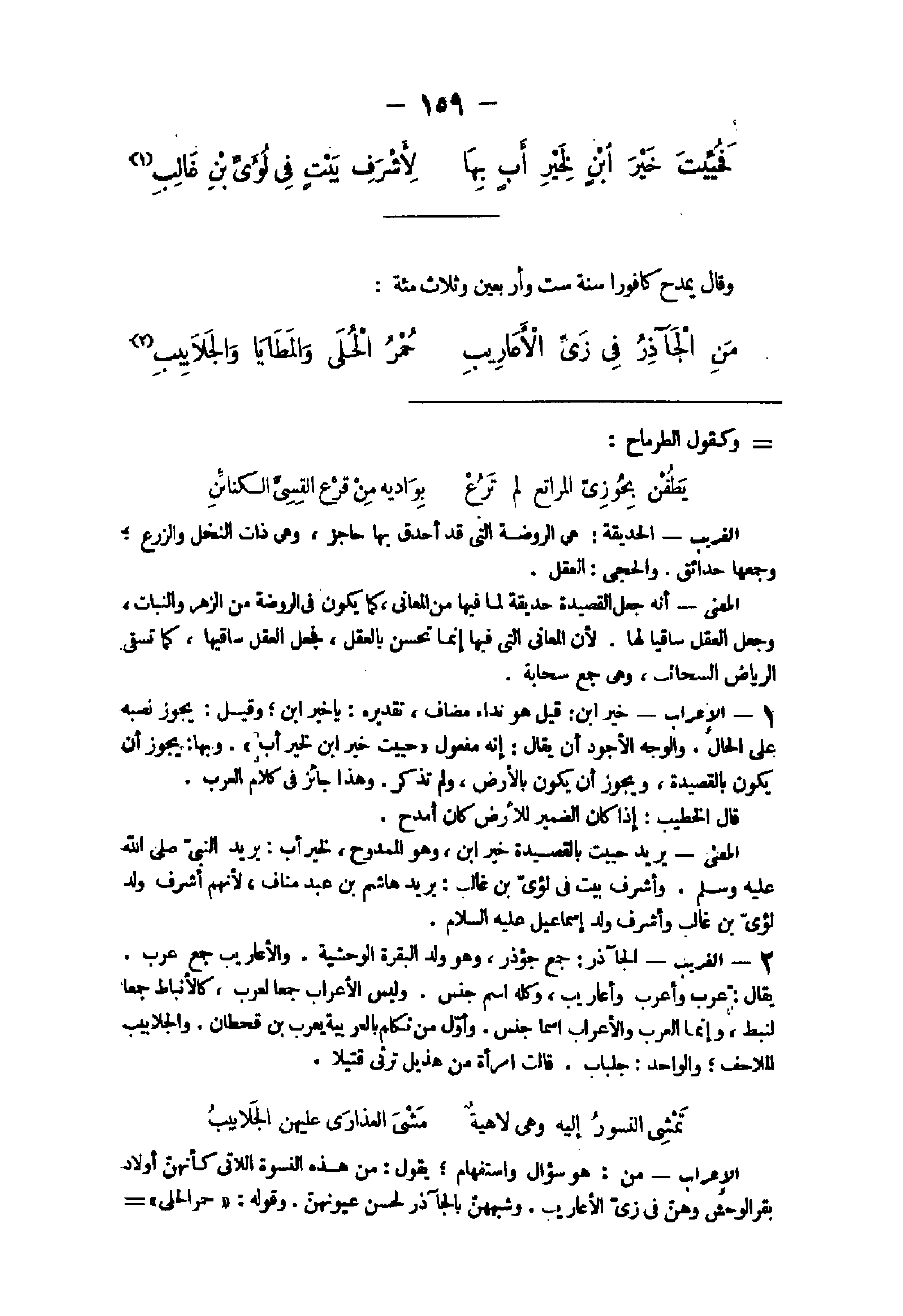 1 - الْغَرِيب الجآذر جمع جؤذر وَهُوَ ولد الْبَقَرَة الوحشية والأعاريب جمع عرب يُقَال عرب وأعرب وأعاريب وَكله اسْم جنس وَلَيْسَ الْأَعْرَاب جمعا لعرب كالأنباط جمعا لنبط وَإِنَّمَا الْعَرَب والأعراب اسْما جنس وَأول من تكلم بِالْعَرَبِيَّةِ يعرب بن قحطان والجلابيب الملاحف وَالْوَاحد جِلْبَاب قَالَت امْرَأَة من هُذَيْل ترثى قَتِيلا