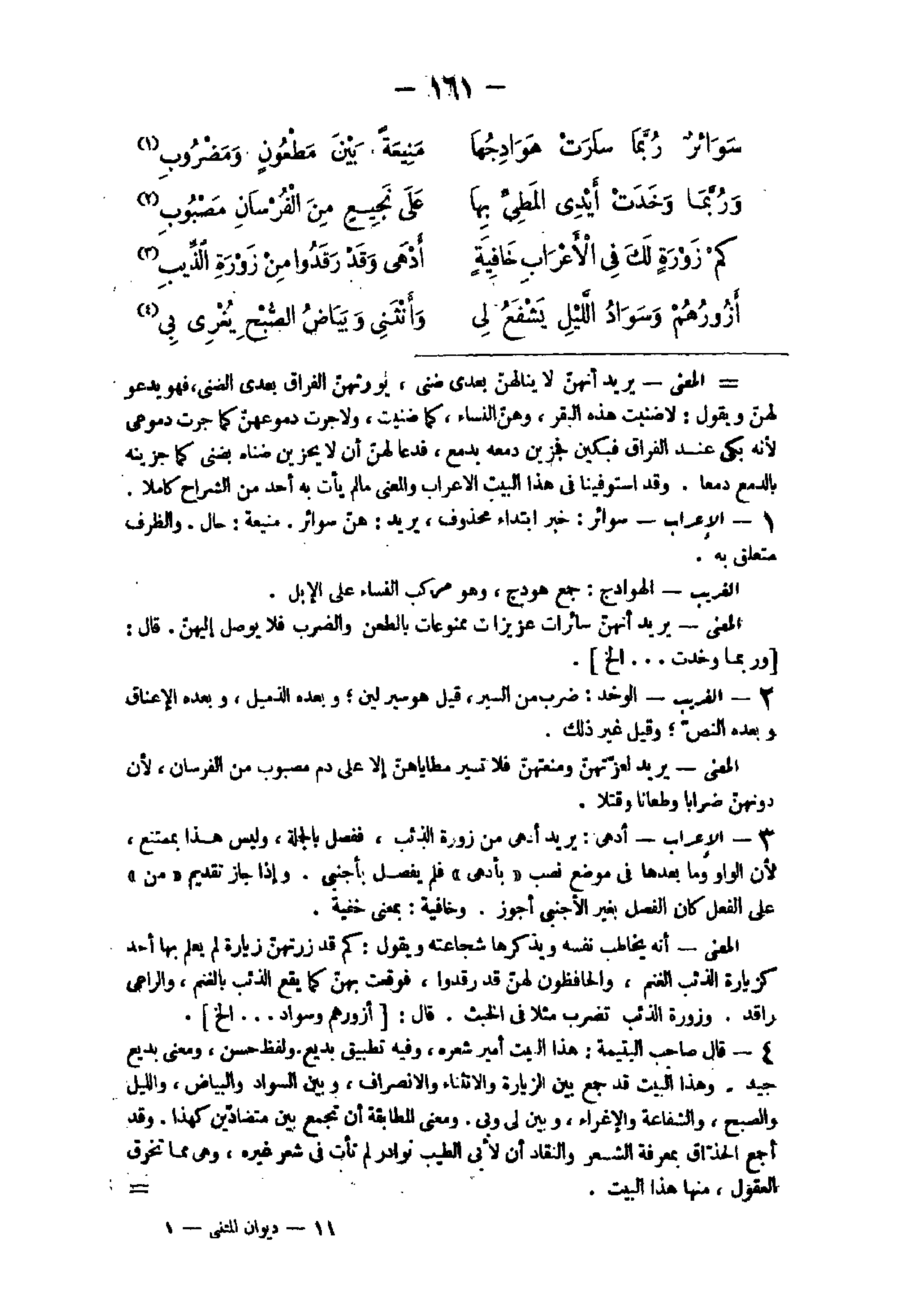 6 - الْإِعْرَاب أدهى يُرِيد أدهى من زورة الذِّئْب ففصل بِالْجُمْلَةِ وَلَيْسَ هَذَا بممتنع لِأَن الْوَاو وَمَا بعْدهَا فى مَوضِع نصب بأدهى فَلم يفصل بأجنبى وَإِذا جَازَ تَقْدِيم من على الْفِعْل كَانَ الْفَصْل بِغَيْر الأجنبى أجوز وخافية بِمَعْنى خُفْيَة الْمَعْنى أَنه يُخَاطب نَفسه ويذكرها شجاعته وَيَقُول كم قد زرتهن زِيَارَة لم يعلم بهَا أحد كزيارة الذِّئْب الْغنم والحافظون لَهُنَّ قد رقدوا فَوَقَعت بِهن كَمَا يَقع الذِّئْب بالغنم والراعى رَاقِد وزورة الذِّئْب تضرب مثلا فى الْخبث قَالَ