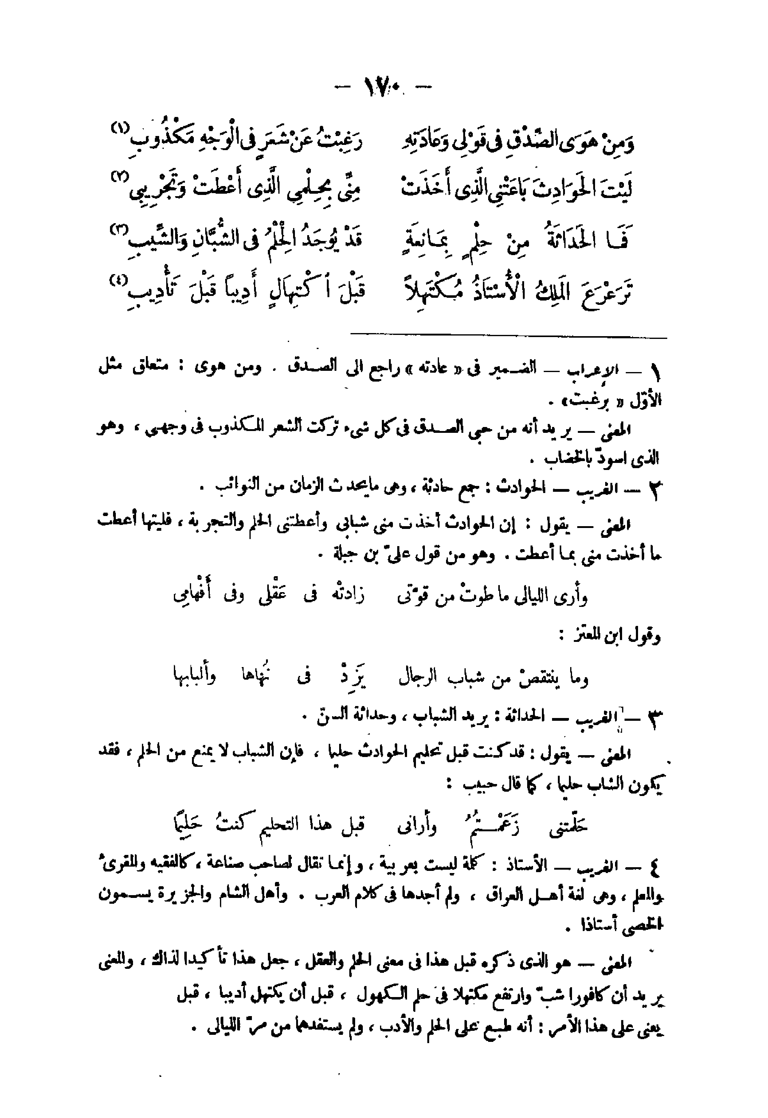 20 - الْغَرِيب الْأُسْتَاذ كلمة لَيست بعربية وَإِنَّمَا تقال لصَاحب صناعَة كالفقيه والمقرئ والمعلم وهى لُغَة أهل الْعرَاق وَلم أَجدهَا فى كَلَام الْعَرَب وَأهل الشَّام والجزيرة يسمون الخصى أستاذا الْمَعْنى هُوَ الذى ذكره قبل هَذَا فى معنى الْحلم وَالْعقل جعل هَذَا تَأْكِيدًا لذَلِك وَالْمعْنَى يُرِيد أَن كافورا شب وارتفع مكتهلا فى حلم الكهول قبل أَن يكتهل وأدبيا قبل أَن يُؤَدب يعْنى أَنه طبع على الْحلم وَالْأَدب وَلم يستفدهما من مر الليالى