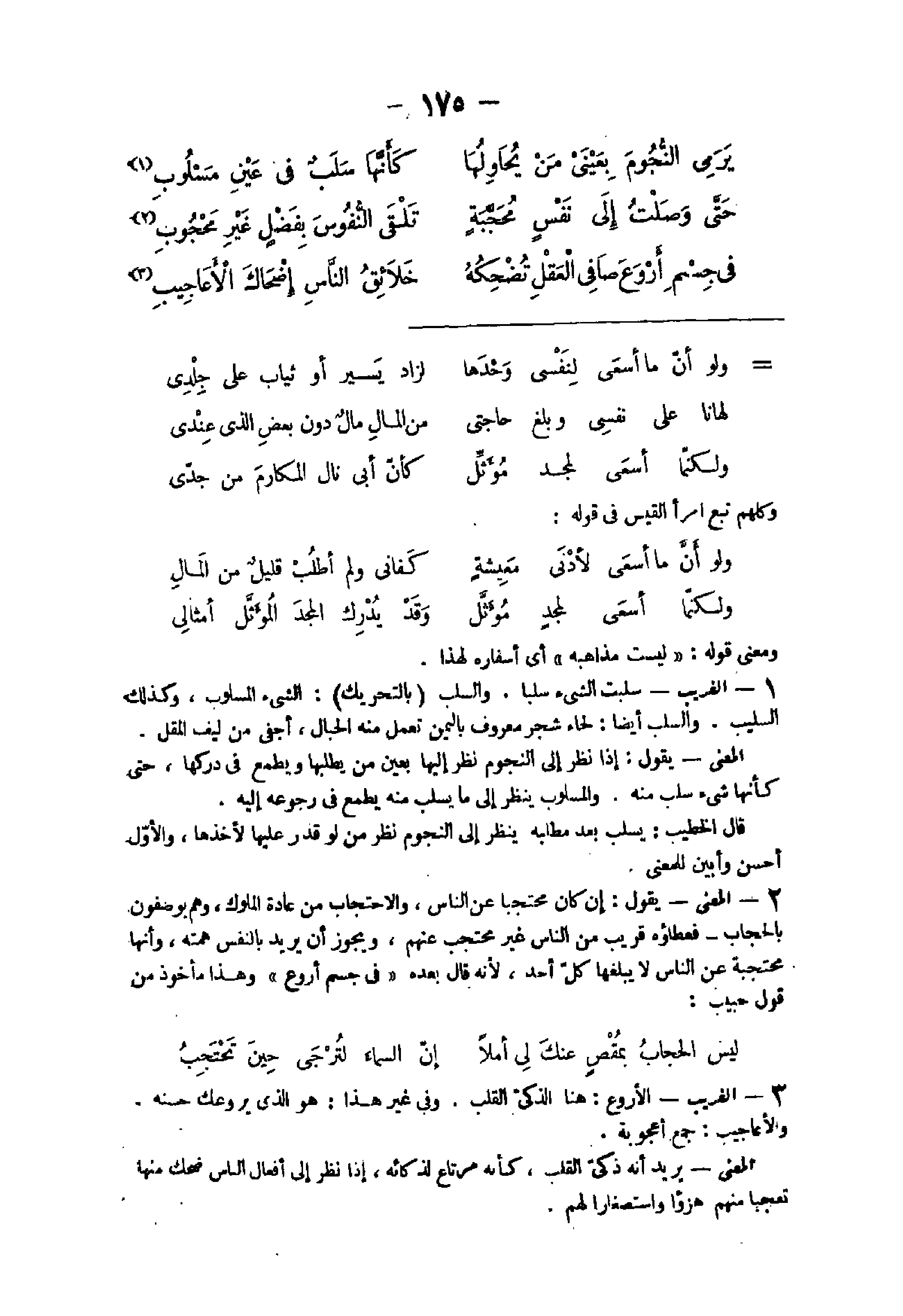 - الْغَرِيب سلبت الشئ سلبا وَالسَّلب بِالتَّحْرِيكِ الشئ المسلوب وَكَذَلِكَ السليب وَالسَّلب أَيْضا لحاء شجر مَعْرُوف بِالْيمن تعْمل مِنْهُ الحبال أجفى من لِيف الْمقل الْمَعْنى يَقُول إِذا نظر إِلَى النُّجُوم نظر إِلَيْهَا بِعَين من يطْلبهَا ويطمع فى دركها حَتَّى كَأَنَّهَا شئ سلب مِنْهُ والمسلوب ينظر إِلَى مَا يسلب مِنْهُ نظر من يطْمع فى رُجُوعه إِلَيْهِ قَالَ الْخَطِيب يسلب بعد مطلبه ينظر إِلَى النُّجُوم نظر من لَو قدر عَلَيْهَا لأخذها وَالْأول أحسن وَأبين للمعنى