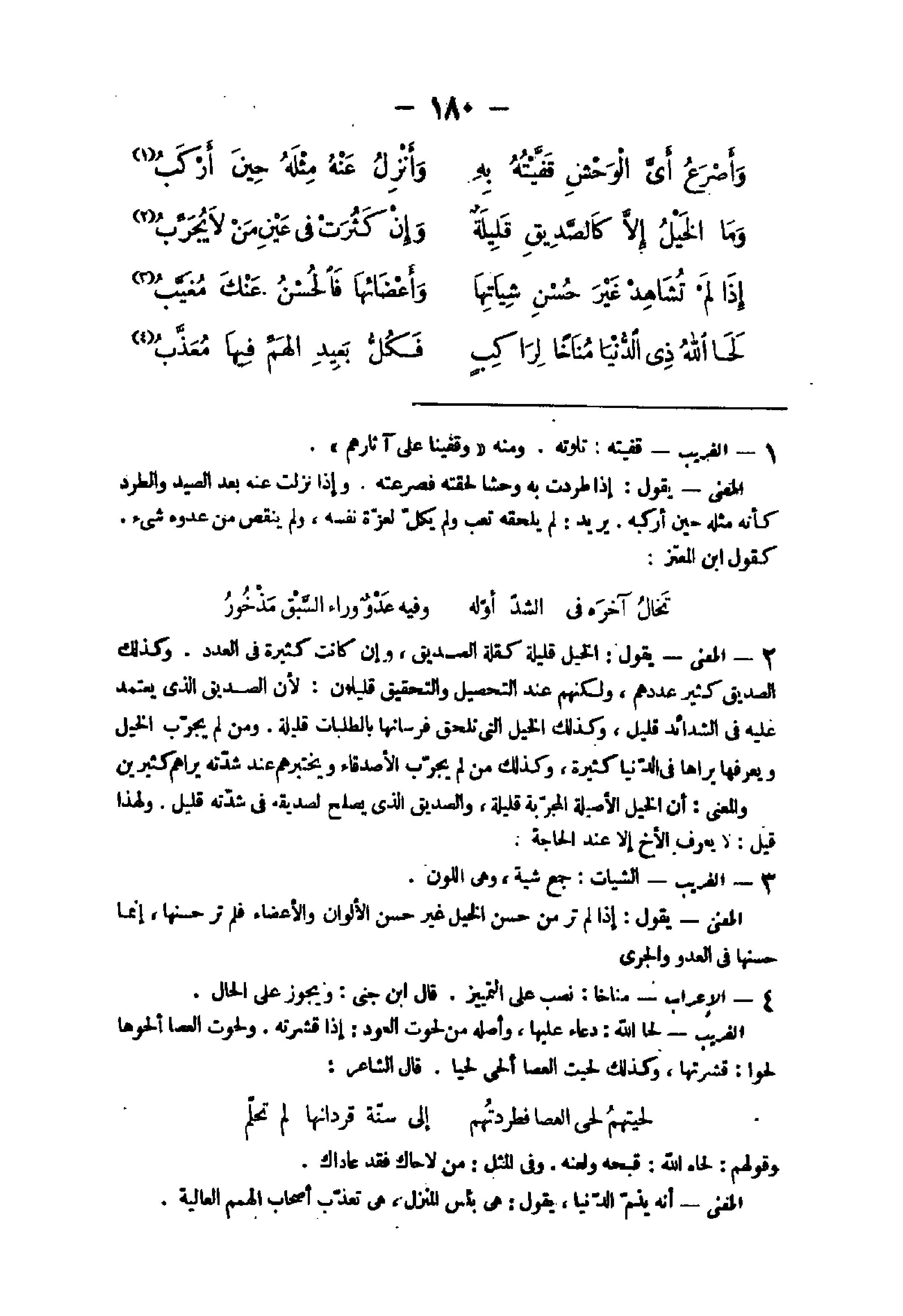 - الْغَرِيب قفيته تلوته وَمِنْه {وقفينا على آثَارهم} الْمَعْنى يَقُول إِذا طردت بِهِ وحشا لحقته فصرعته وَإِذا نزلت عَنهُ بعد الصَّيْد والطرد كَانَ مثله حِين أركبه يُرِيد لم يلْحقهُ تَعب وَلم يكل لعزة نَفسه وَلم ينقص من عدوه شئ كَقَوْل ابْن المعتز