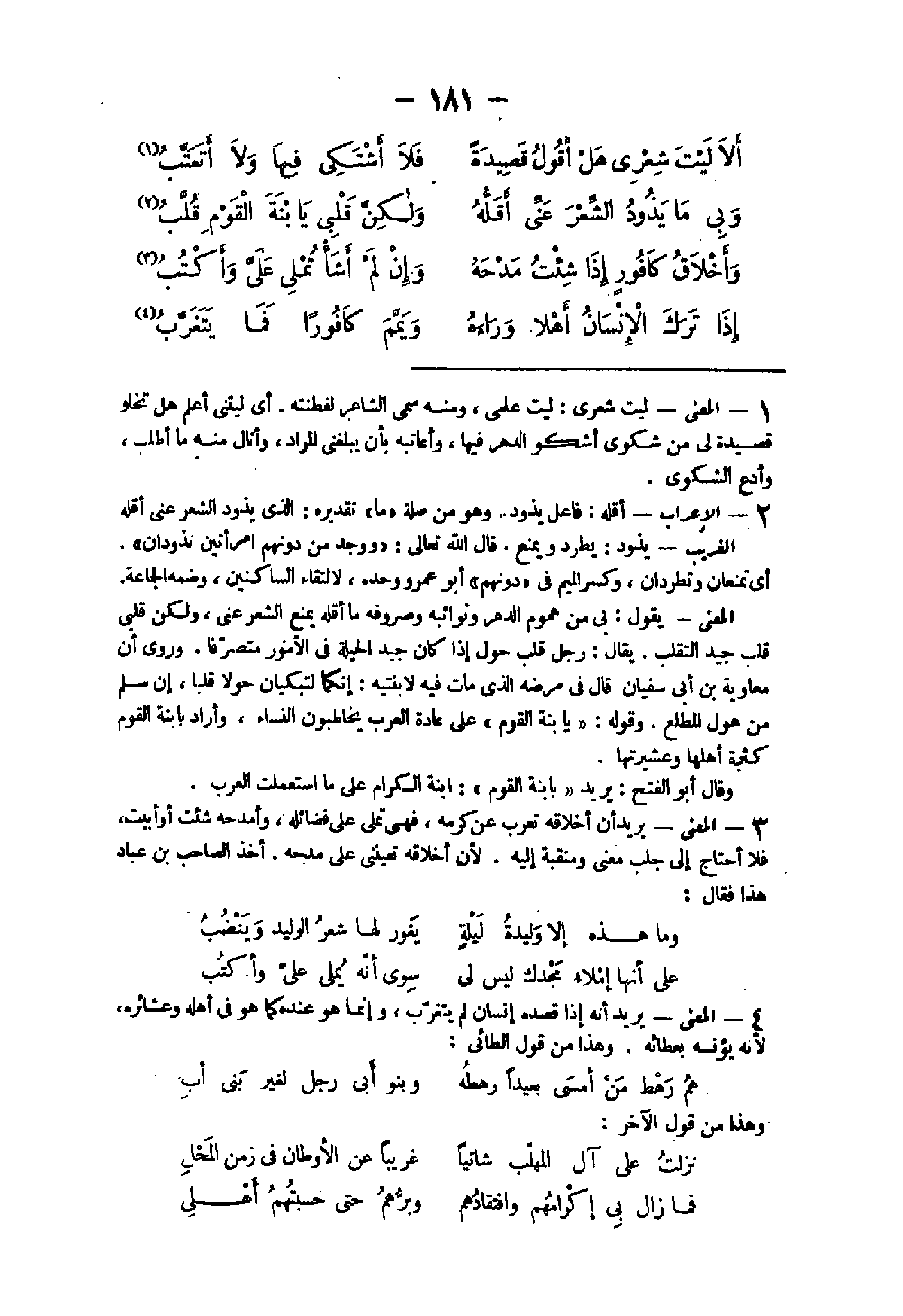 - الْمَعْنى لَيْت شعرى لَيْت علمى وَمِنْه سمى الشَّاعِر لفطنته أى ليتنى أعلم هَل تَخْلُو قصيدة لى من شكوى أَشْكُو الدَّهْر فِيهَا وأعاتبه بِأَن يبلغنى المُرَاد وأنال مِنْهُ مَا أطلب وأدع الشكوى