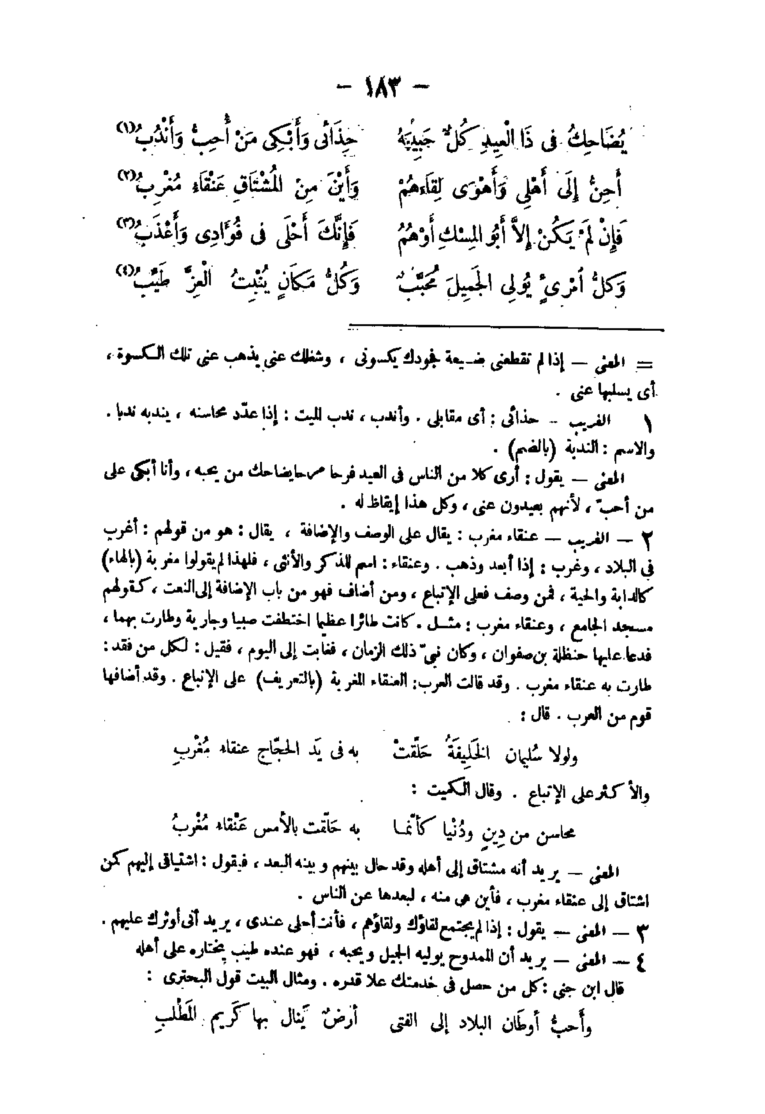 - الْغَرِيب حذائى أى مقابلى وأندب ندب الْمَيِّت إِذا عدد محاسنه يندبه ندبا وَالِاسْم الندبة بِالضَّمِّ الْمَعْنى يَقُول أرى كلا من النَّاس فى الْعِيد فَرحا مرحا يضاحك من يُحِبهُ وَأَنا أبكى على من أحب لأَنهم بعيدون عَنى وكل هَذَا إيقاظ لَهُ