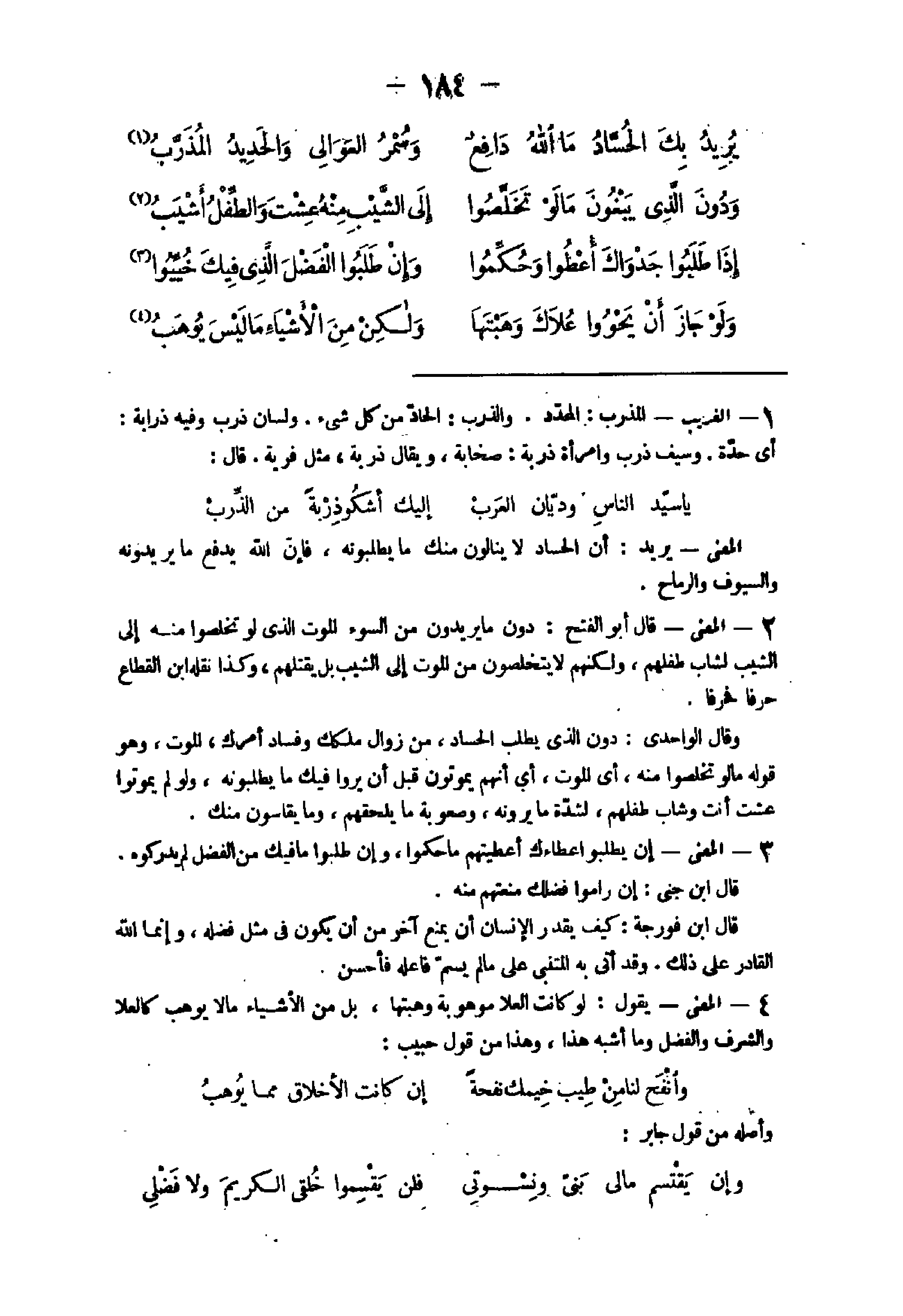 3 - الْمَعْنى قَالَ أَبُو الْفَتْح دون مَا يُرِيدُونَ من السوء الْمَوْت الذى لَو تخلصوا مِنْهُ إِلَى الشيب لشاب طفلهم وَلَكنهُمْ لَا يتخلصون من الْمَوْت إِلَى الشيب بل يقتلهُمْ وَكَذَا نَقله ابْن القطاع حرفا فحرفا وَقَالَ الواحدى دون الذى يطْلب الحساد من زَوَال ملكك وَفَسَاد أَمرك الْمَوْت وَهُوَ قَوْله مَا لَو تخلصوا مِنْهُ أى الْمَوْت أى أَنهم يموتون قبل أَن يرَوا فِيك مَا يطلبونه وَلَو لم يموتوا عِشْت أَنْت وشاب طفلهم لشدَّة مَا يرونه وصعوبة مَا يلحقهم وَمَا يقاسون مِنْك