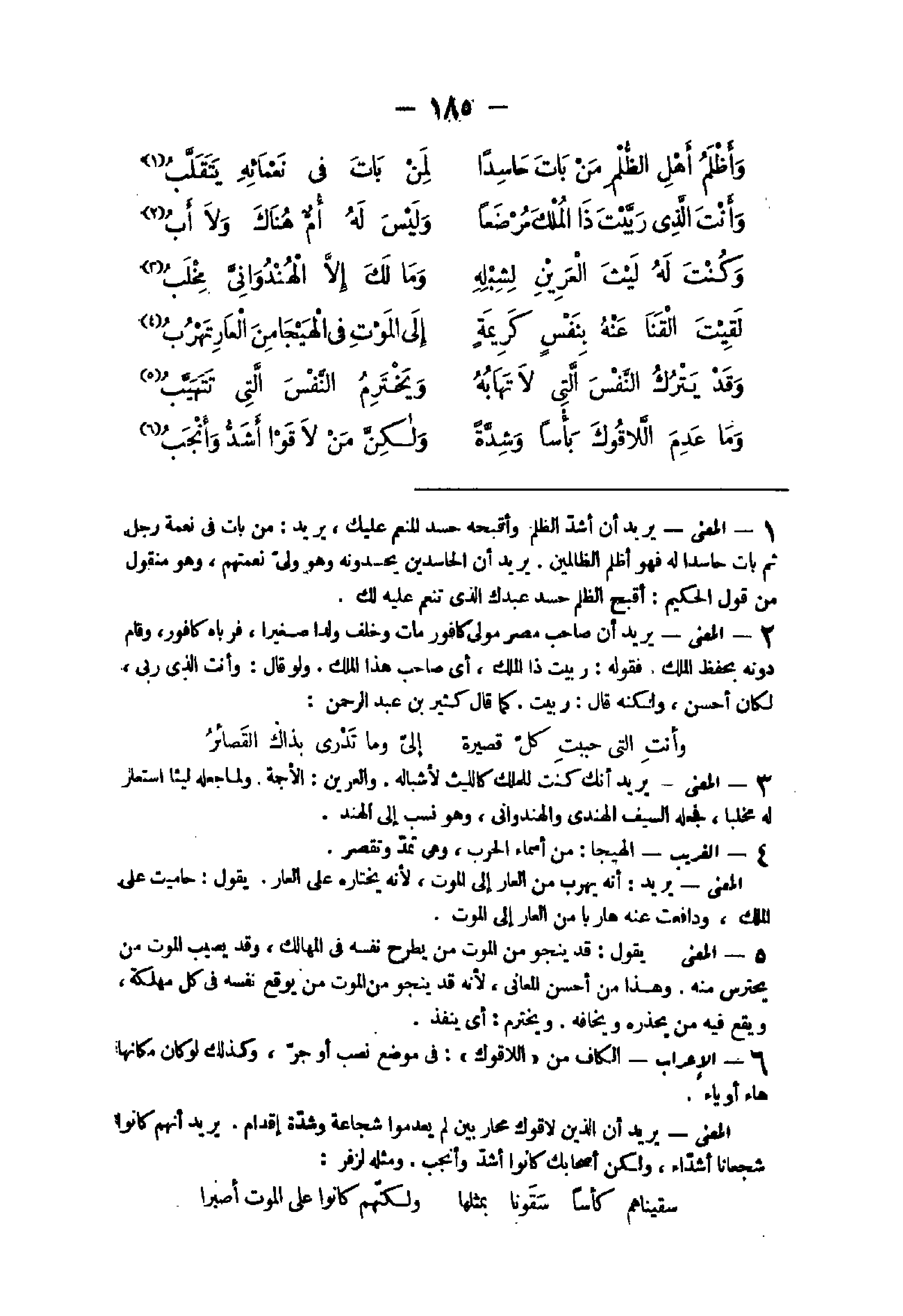 35 - الْمَعْنى يُرِيد أَنَّك كنت للْملك كالليث لأشباله والعريبن الأجمة وَلما جعله ليثا اسْتعَار لَهُ مخلبا فَجعله السَّيْف الهندى والهندوانى وَهُوَ نسب إِلَى الْهِنْد