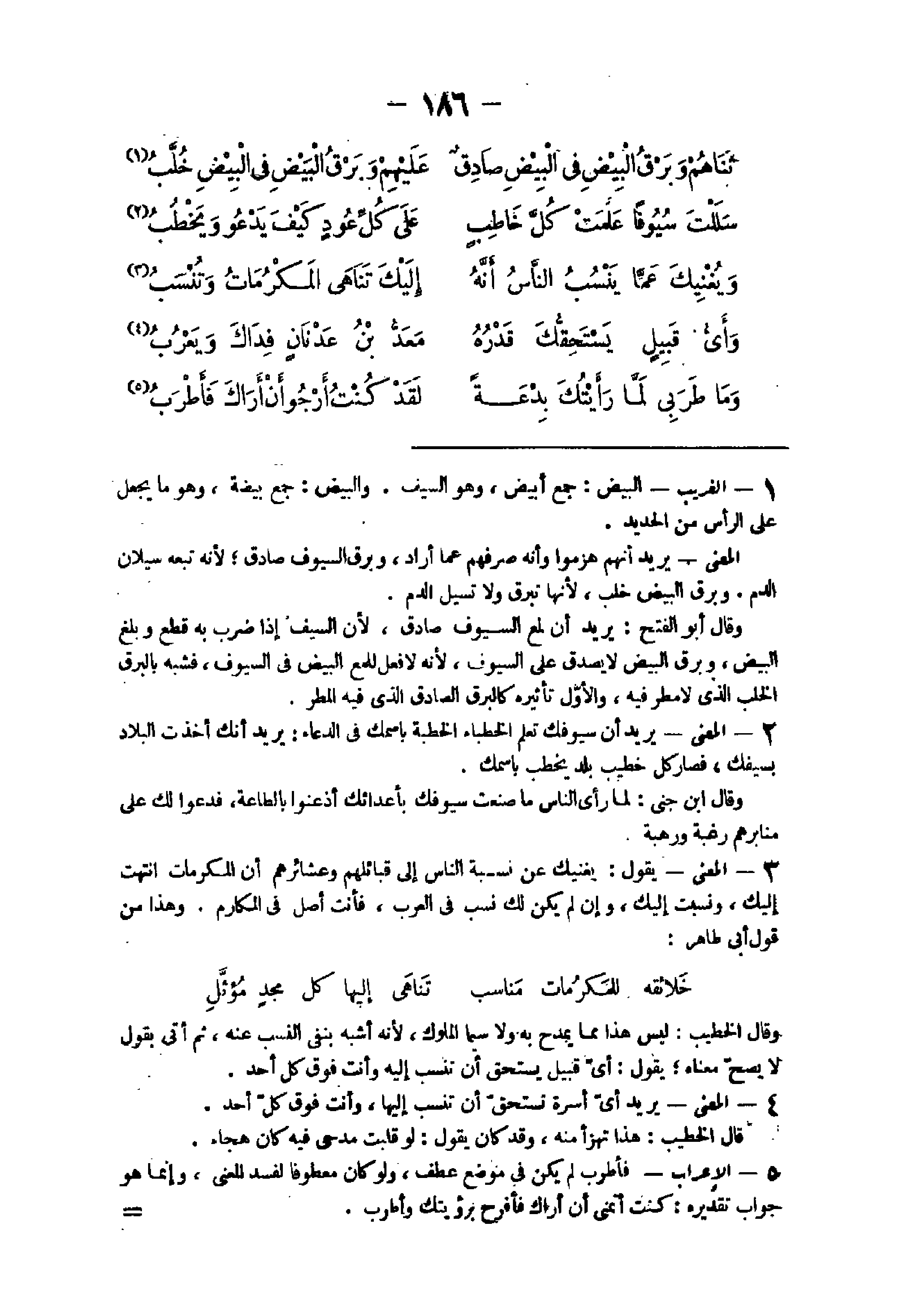 43 - الْإِعْرَاب فأطرب لم يكن فى مَوضِع عطف وَلَو كَانَ مَعْطُوفًا لفسد الْمَعْنى وَإِنَّمَا هُوَ جَوَاب تَقْدِيره كنت أَتَمَنَّى أَن أَرَاك فَأَفْرَح برؤيتك وأطرب الْمَعْنى قَالَ الواحدى هَذَا الْبَيْت يشبه الِاسْتِهْزَاء لِأَنَّهُ يَقُول طربت على رؤيتك كَمَا يطرب الْإِنْسَان على رُؤْيَة القرد وَمَا يستملحه مِمَّا يضْحك مِنْهُ قَالَ أَبُو الْفَتْح لما قَرَأت عَلَيْهِ هَذَا الْبَيْت قلت لَهُ جعلت الرجل أَبَا زنة وهى كنية القرد فَضَحِك