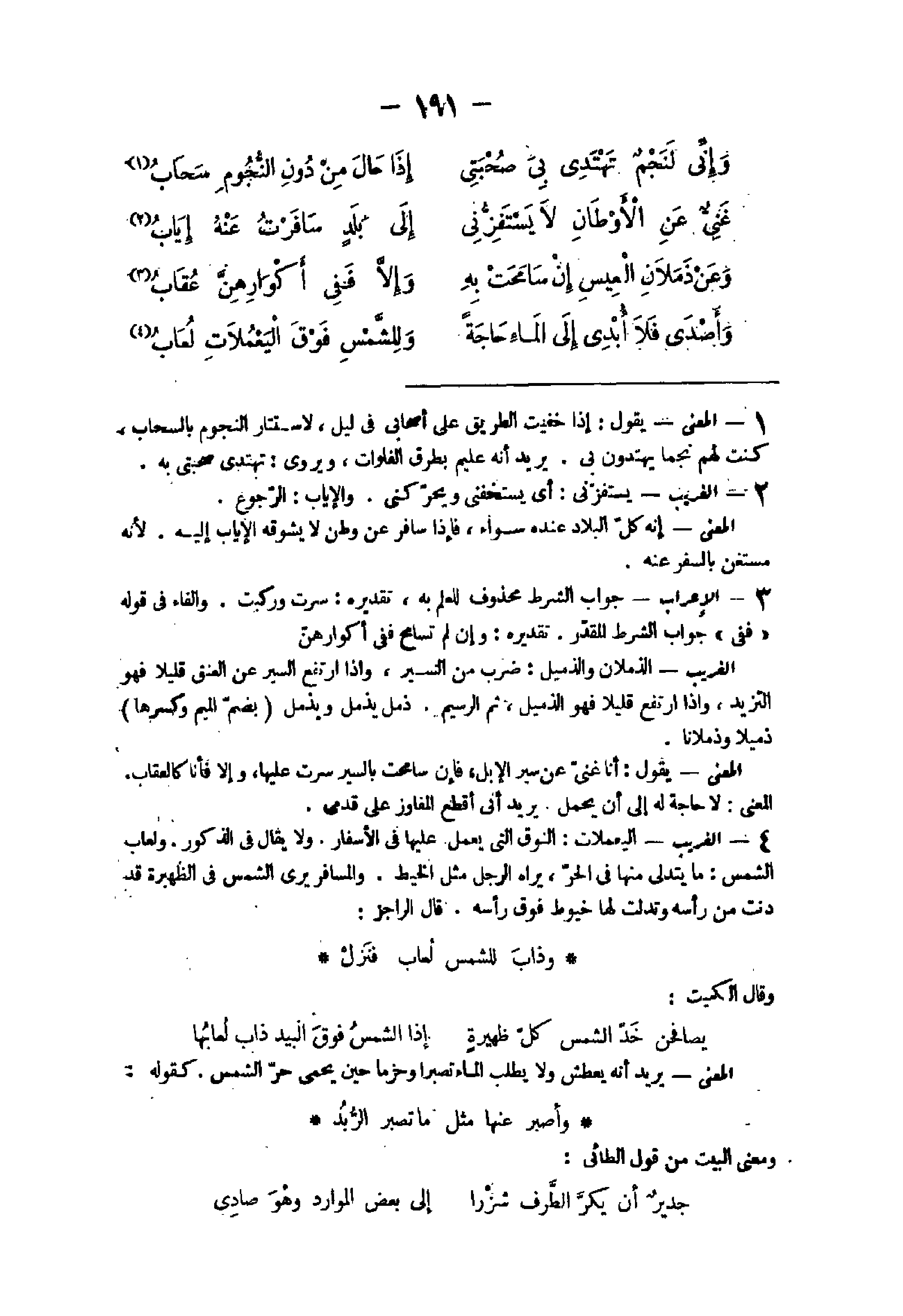- الْمَعْنى يَقُول إِذا خفيت الطَّرِيق على أصحابى فى ليل لاستتار النُّجُوم بالسحاب كنت لَهُم نجما يَهْتَدُونَ بى يُرِيد أَنه عليم بطرق الفلوات ويروى تهتدى صحبتى بِهِ