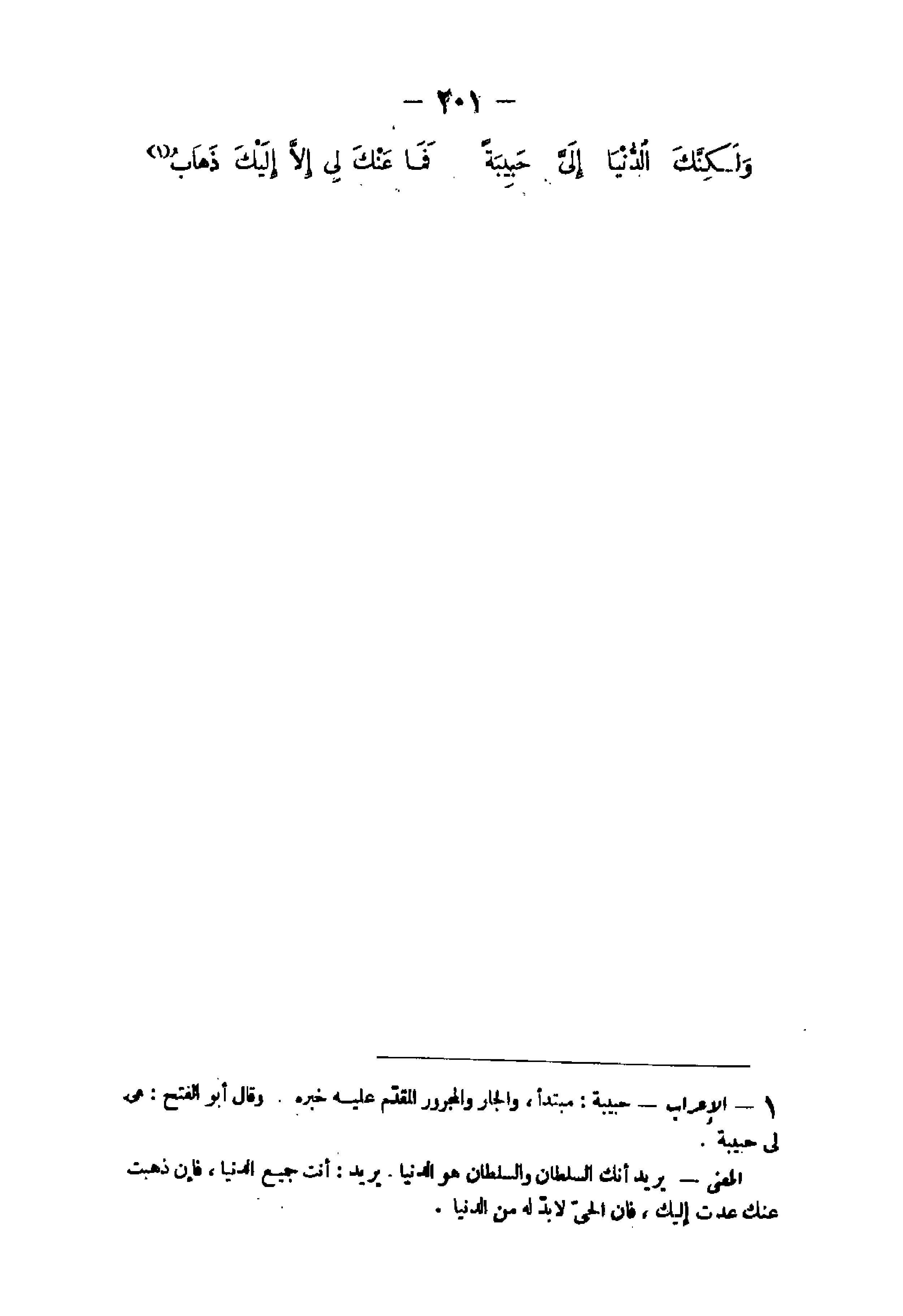 - الْإِعْرَاب حَبِيبَة مُبْتَدأ وَالْجَار وَالْمَجْرُور الْمُقدم عَلَيْهِ خَبره وَقَالَ أَبُو الْفَتْح هى لى حَبِيبَة الْمَعْنى يُرِيد أَنَّك السُّلْطَان وَالسُّلْطَان هُوَ الدُّنْيَا يُرِيد أَنْت جَمِيع الدُّنْيَا فَإِن ذهبت عَنْك عدت إِلَيْك فَإِن الحى لابد لَهُ من الدُّنْيَا