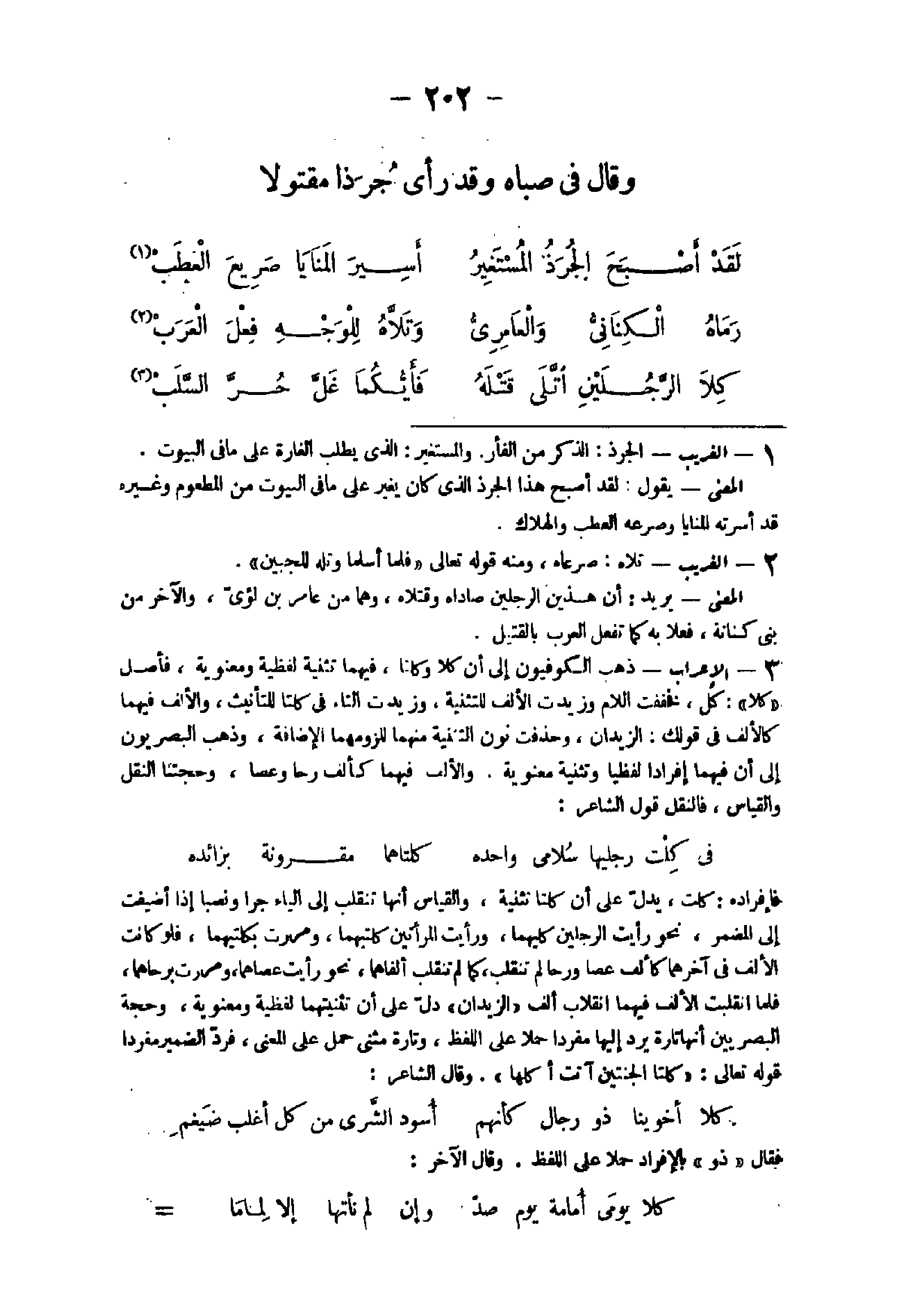 فَقَالَ فقد أقلعا حملا على الْمَعْنى وَقَالُوا الدَّلِيل على أَن فيهمَا إفرادا لفظيا أَنَّك تضيفهما إِلَى التَّثْنِيَة فَتَقول جاءنى كل أخويك وَرَأَيْت كليهمَا وَكَذَلِكَ حكم كلتا فى الْمُضمر والمظهر فَلَو كَانَت التتثنية فيهمَا لفطية لما جَازَ إضافتهما إِلَى التَّثْنِيَة لِأَن الشئ لَا يُضَاف إِلَى نَفسه وَيدل على أَن الْألف لَا تكون فيهمَا للتثنية أَنَّهَا تمال فى قِرَاءَة حَمْزَة والكسائى وَقد اسْتَوْفَيْنَا هَذَا بأبسط مِنْهُ فى كتَابنَا الموسوم بتزهة الْعين فى اخْتِلَاف المذهبين الْمَعْنى يَقُول كِلَاهُمَا تولى قَتله يُرِيد اشتركتما فى قَتله فأيكما انْفَرد بسلبه وَهُوَ أَن الْمَقْتُول إِذا قتل كَانَ سلبه لقاتله وَمِنْه فى // الحَدِيث الصَّحِيح // " من قتل قَتِيلا فَلهُ سلبه " وحره جيده وغل من الْغلُول وهى الْخِيَانَة فى الْمَغَانِم وَهَذَا كُله يَقُوله استهزاء بهما