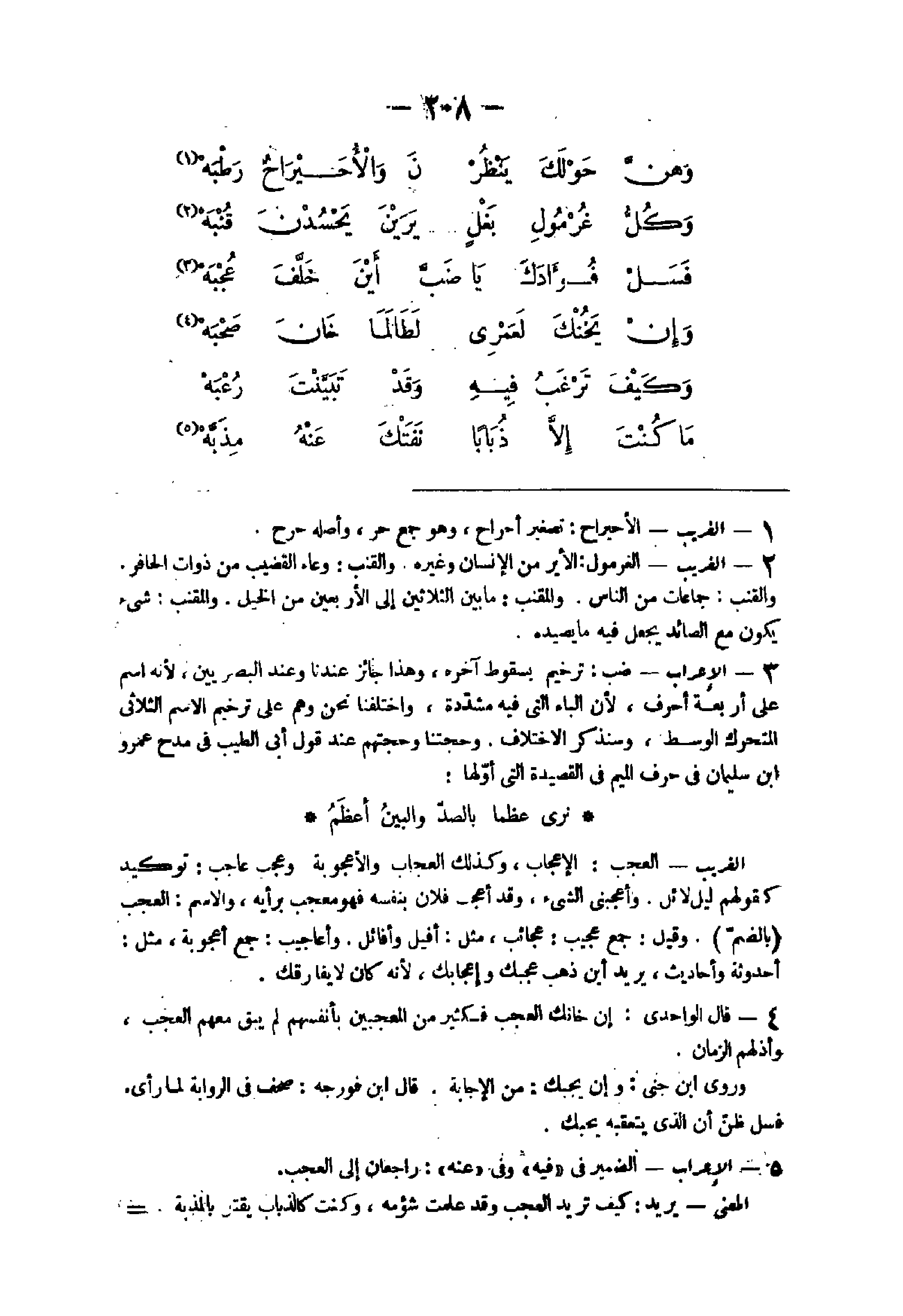 29 - الْإِعْرَاب الضَّمِير فى فِيهِ وفى عَنهُ راجعان إِلَى الْعجب الْمَعْنى يُرِيد كَيفَ تُرِيدُ الْعجب وَقد علمت شؤمه وَكنت كالذباب يقتل وَقَالَ ابْن جنى يُرِيد بقيت بِلَا قلب قَالَ ابْن فورجة ظن أَن الْهَاء فى قَوْله عَنهُ رَاجِعَة إِلَى الْقلب وَذَلِكَ // بَاطِل // وَالْهَاء رَاجِعَة إِلَى الْعجب