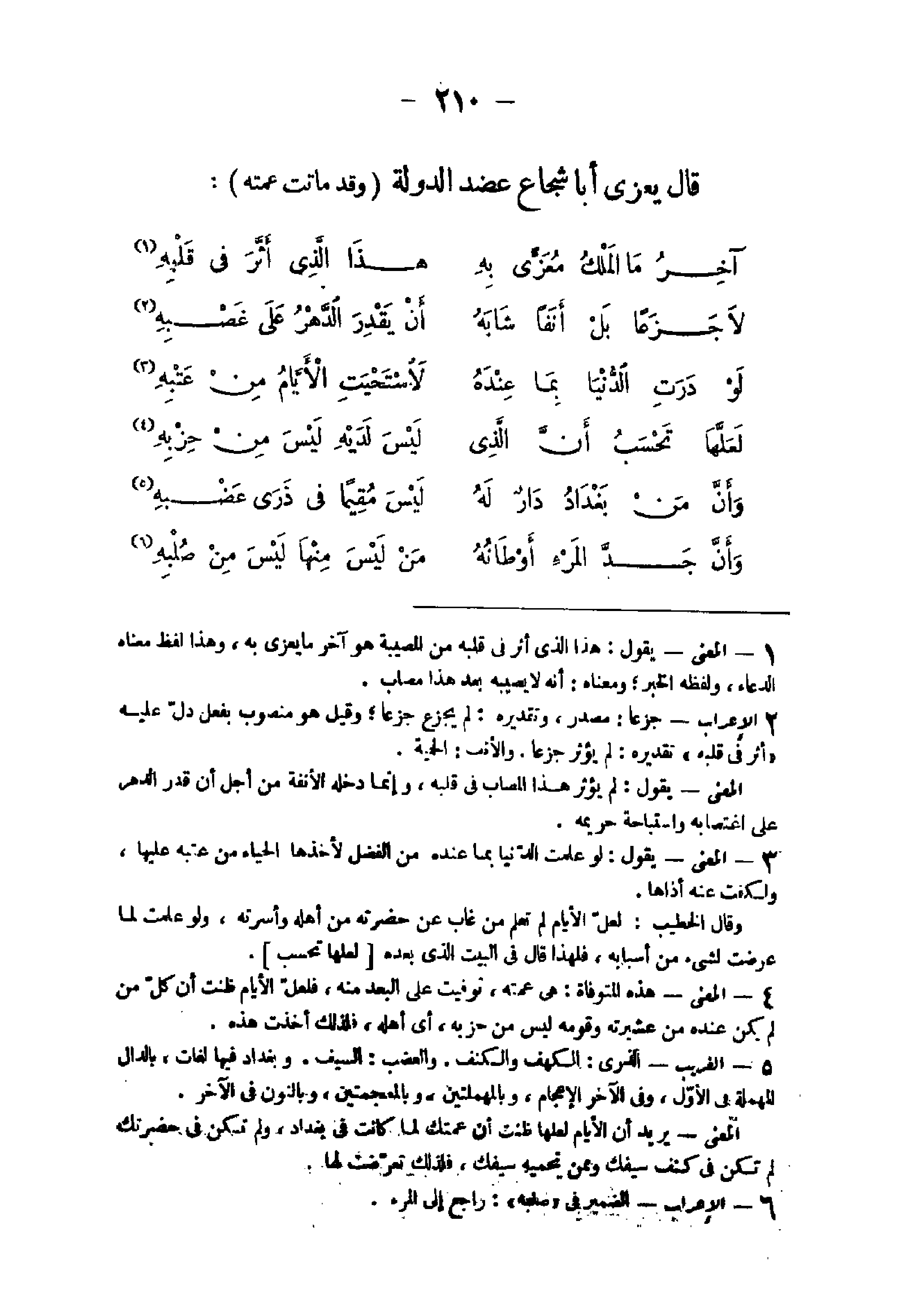 5 - الْغَرِيب الذرى الْكَهْف والكنف والعضب السَّيْف وبغداد فِيهَا لُغَات بِالدَّال الْمُهْملَة فى الأول وفى الآخر الإعجام وبالمهملتين وبالمعجمتين وبالنون فى الآخر الْمَعْنى يُرِيد أَن الْأَيَّام لَعَلَّهَا ظنت أَن عَمَّتك لما كَانَت فى بَغْدَاد وَلم تكن فى حضرتك لم تكن فى كنف سَيْفك وَمِمَّنْ يحميه سَيْفك فَلذَلِك تعرضت لَهَا