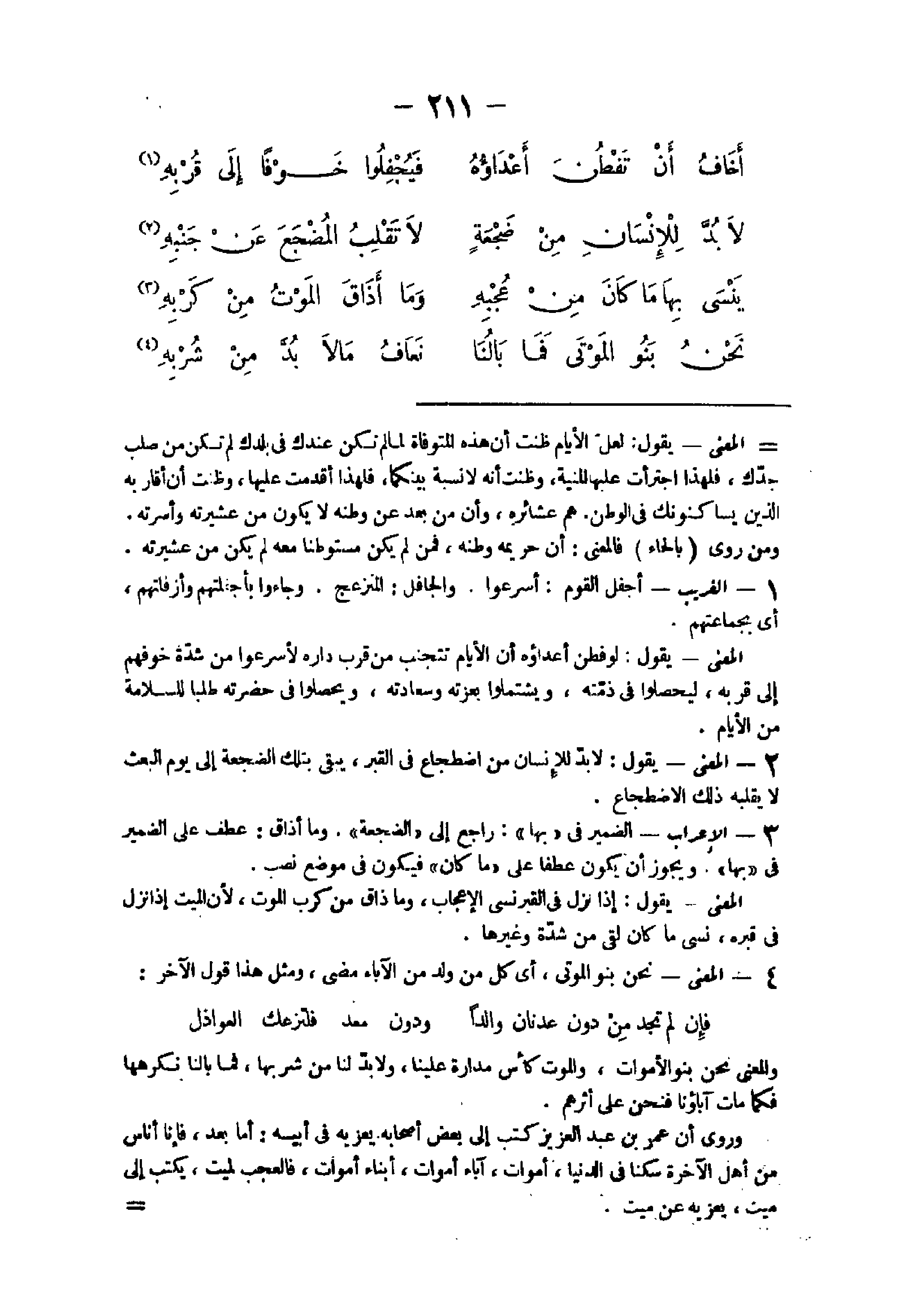 وَالْمعْنَى نَحن بَنو الْأَمْوَات وَالْمَوْت كأس مدارة علينا ولابد لنا من شربهَا فَمَا بالنا نكْرههَا فَكَمَا مَاتَ آبَاؤُنَا فَنحْن على إثرهم وروى أَن عمر بن عبد الْعَزِيز كتب إِلَى بعض أَصْحَابه يعزيه فى أَبِيه أما بعد فَإنَّا أَنا من أهل الْآخِرَة سكنا فى الدُّنْيَا أَمْوَاتًا آبَاء أموات أَبنَاء أموات فالعجب لمَيت يكْتب إِلَى ميت يعزيه عَن ميت وَقَالَ متمم بن نُوَيْرَة