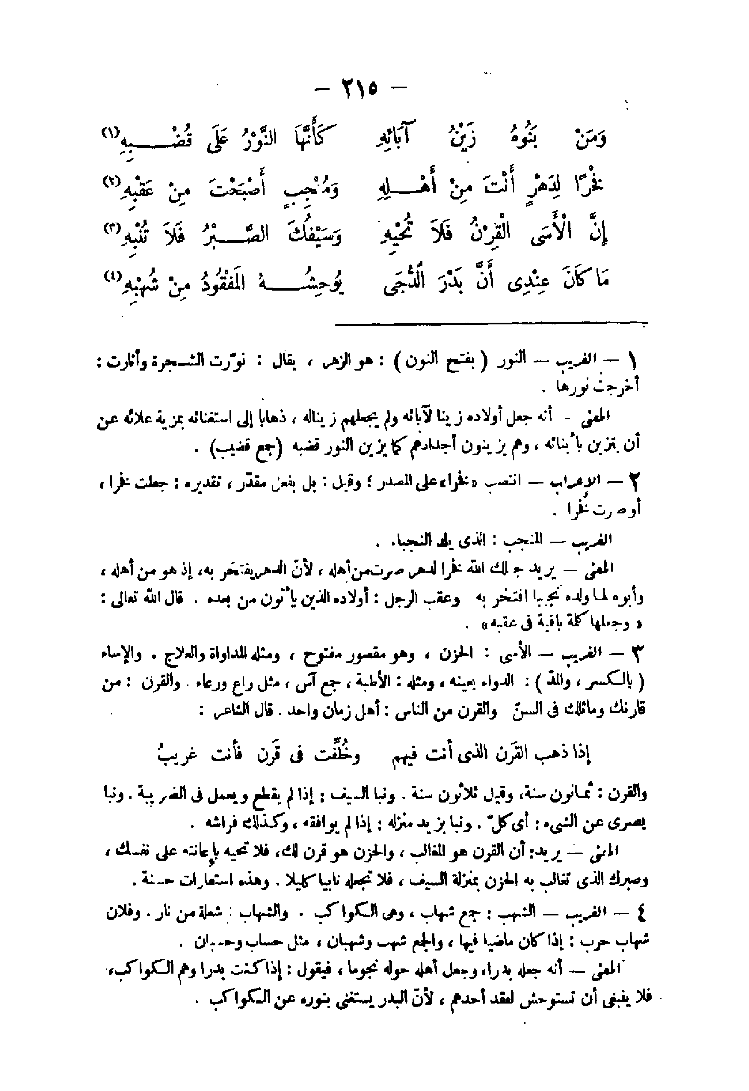 - الْغَرِيب النُّور بِفَتْح النُّون هُوَ الزهر يُقَال نورت الشَّجَرَة وأنارت أخرجت نورها الْمَعْنى أَنه جعل أَوْلَاده زينا لِآبَائِهِ وَلم يجعلهم زينا لَهُ ذَهَابًا إِلَى استغنائه بمزية علائه عَن أَن يتزين بأبنائه وهم يزينون أجدادهم كَمَا يزين النُّور قضبه جمع قضيب