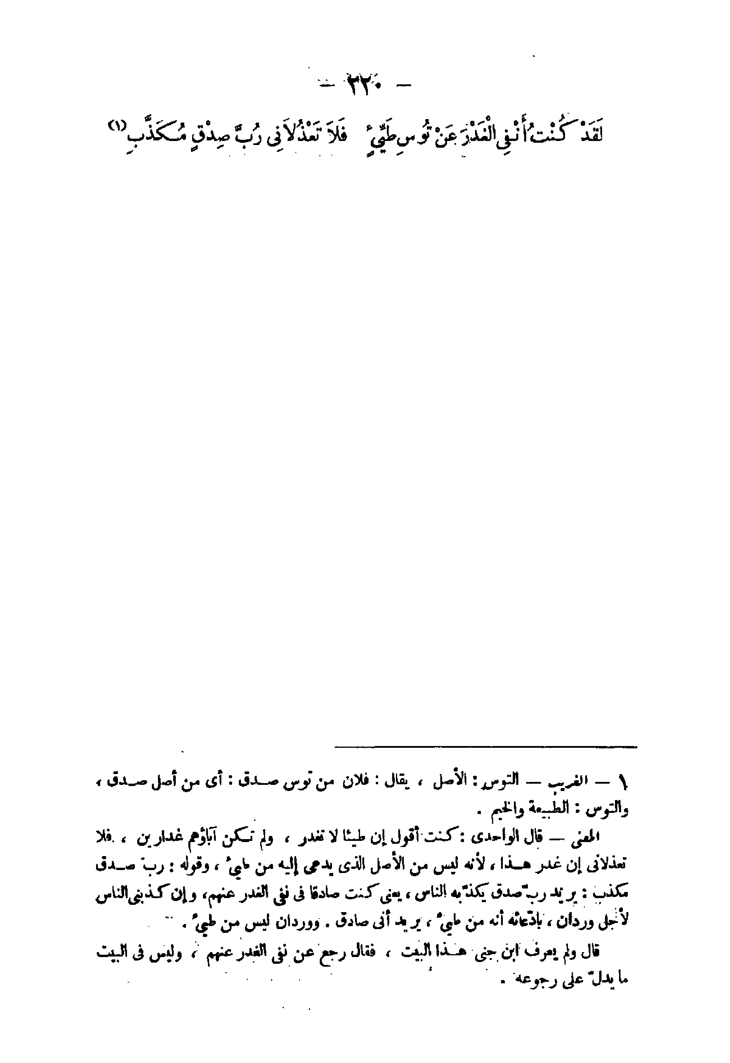 صدق أى من أصل صدق والتوس الطبيعة والخيم الْمَعْنى قَالَ الواحدى كنت أَقُول إِن طيئا لَا تغدر وَلم تكن آباؤهم غدارين فَلَا تعذلانى إِن غدر هَذَا لِأَنَّهُ لَيْسَ من الأَصْل الذى يدعى إِلَيْهِ طَيئ وَقَوله رب صدق مكذب يُرِيد رب صدق يكذبهُ النَّاس يعْنى كنت صَادِقا فى نفى الْغدر عَنْهُم وَإِن كذبنى النَّاس لأجل وردان بادعائه أَن من طَيئ يُرِيد أَنى صَادِق ووردان لَيْسَ من طَيئ قَالَ وَلم يعرف ابْن جنى هَذَا الْبَيْت فَقَالَ رَجَعَ عَن نفى الْغدر عَنْهُم وَلَيْسَ فى الْبَيْت مَا يدل على رُجُوعه