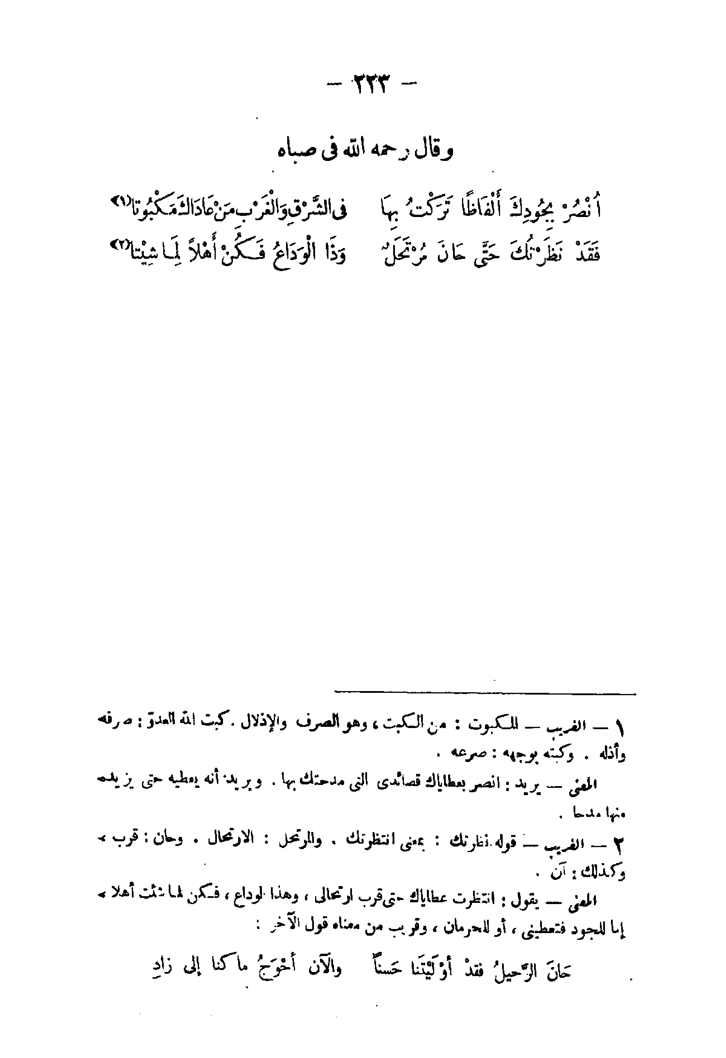 2 - الْغَرِيب قَوْله نظرتك بِمَعْنى انْتَظَرْتُك والمرتحل الارتحال وحان قرب وَكَذَلِكَ آن الْمَعْنى يَقُول انتظرت عطاياك حَتَّى قرب ارتحالى وَهَذَا الْوَدَاع فَكُن لما شِئْت أَهلا إِمَّا للجود فتعطنى أَو للحرمان وَقَرِيب من مَعْنَاهُ قَول الآخر