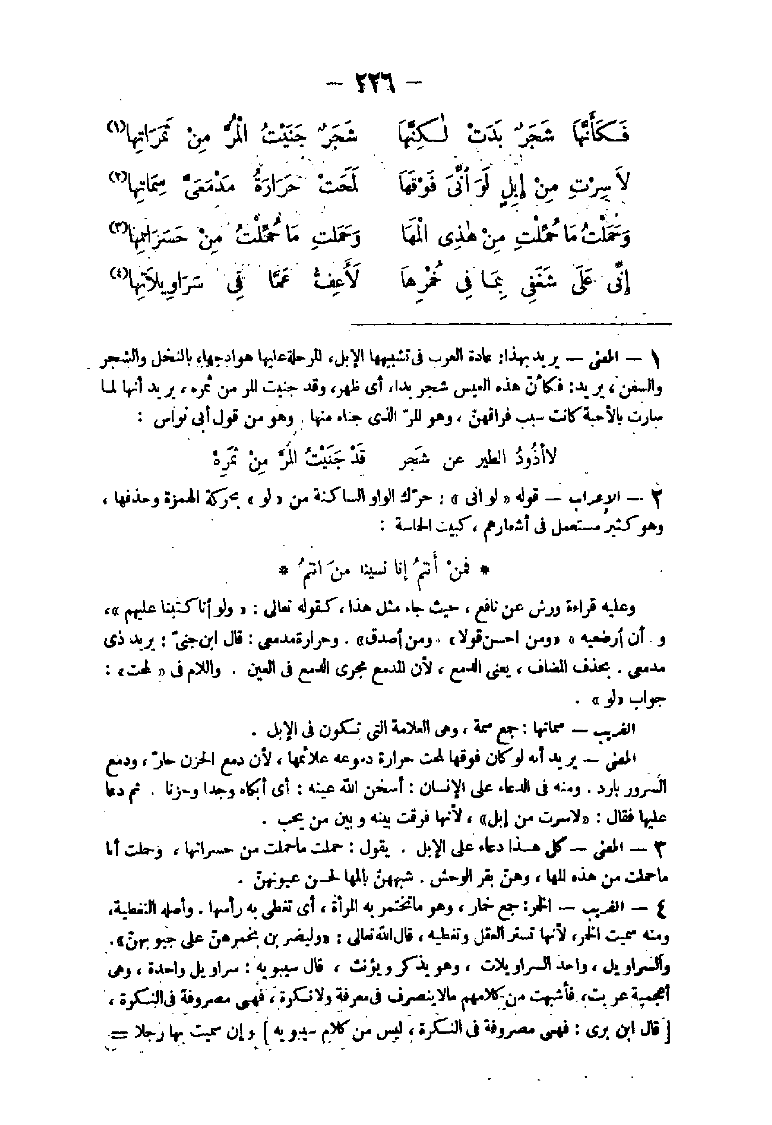 - الْمَعْنى يُرِيد بِهَذَا عَادَة الْعَرَب فى تشبيهها الْإِبِل المرحلة عَلَيْهَا هوادجها بِالنَّخْلِ وَالشَّجر والسفن يُرِيد فَكَأَن هَذِه العيس شجر بدا أى ظهر وَقد جنيت المر من ثمره يُرِيد أَنَّهَا لما سَارَتْ بالأحبة كَانَت سَبَب فراقهن وَهُوَ المر الذى جناه مِنْهَا وَهُوَ من قَول أَبى نواس