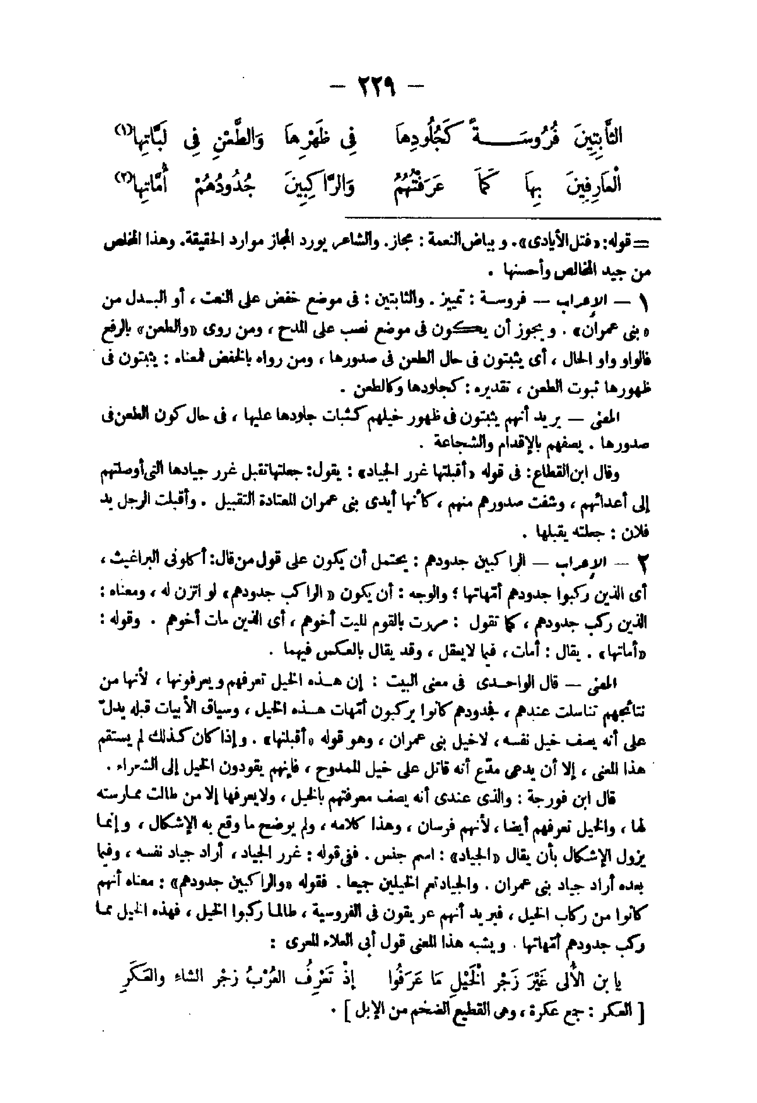 - الْإِعْرَاب فروسة تَمْيِيز والثابتين فى مَوضِع خفض على النَّعْت أَو الْبَدَل من بنى عمرَان وَيجوز أَن يكون فى مَوضِع نصب على الْمَدْح وَمن روى والطعن بِالرَّفْع فالواو وَاو الْحَال أى يثبتون فى حَال الطعْن فى صدورها وَمن رَوَاهُ بالخفض فَمَعْنَاه يثبتون فى ظُهُورهَا ثُبُوت الطعْن تَقْدِيره كجلودها وكالطعن الْمَعْنى يُرِيد أَنهم يثبتون فى ظُهُور خيلهم كثبوت جلودها عَلَيْهَا فى حَال كَون الطعْن فى صدورها يصفهم بالإقدام والشجاعة وَقَالَ ابْن القطاع فى قَوْله