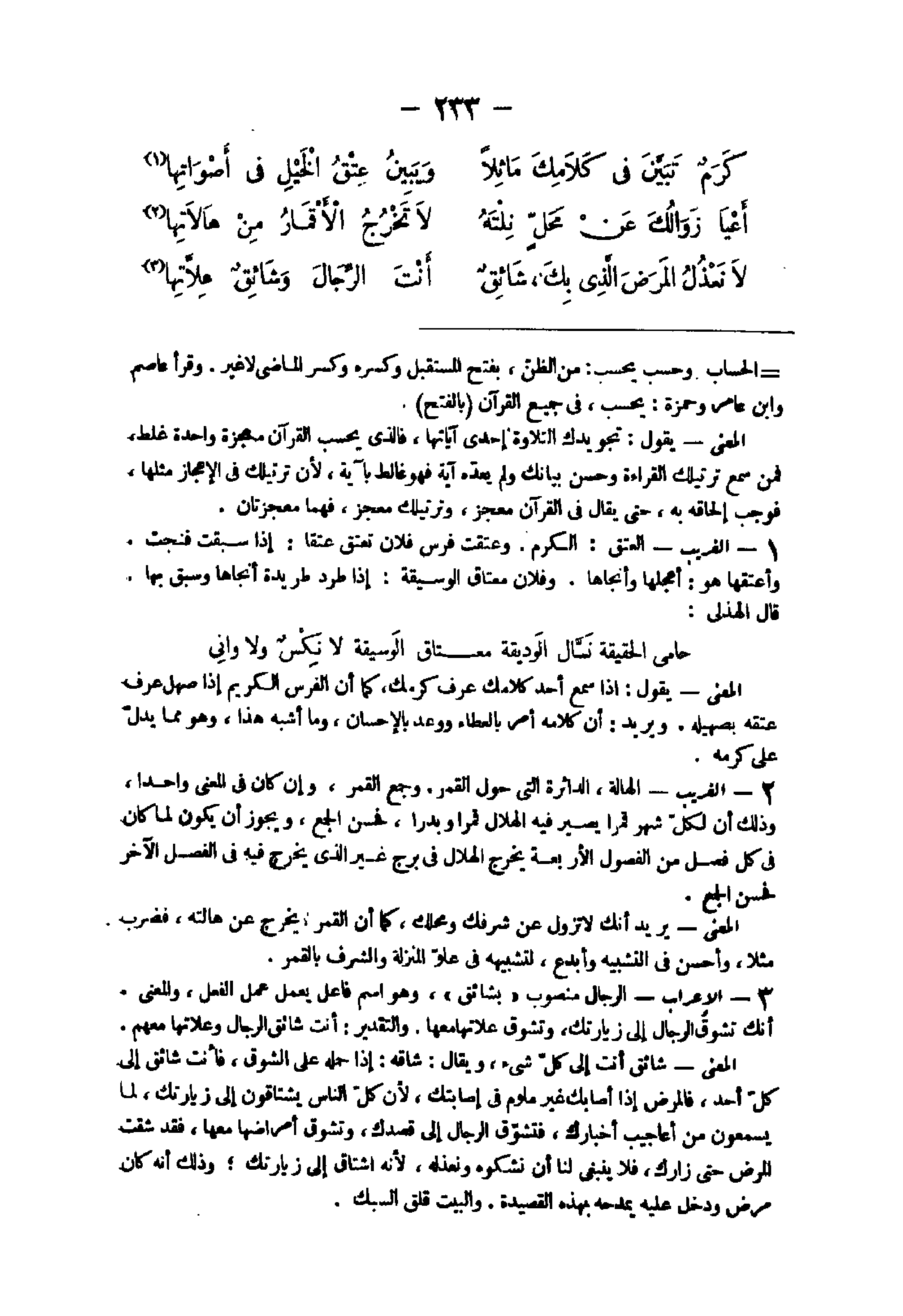 29 - الْإِعْرَاب الرِّجَال مَنْصُوب بشائق وَهُوَ اسْم فَاعل يعْمل عمل الْفِعْل وَالْمعْنَى أَنَّك تشوق الرِّجَال إِلَى زيارتك وَتَشَوُّقِ علاتها مَعهَا وَالتَّقْدِير أَنْت شائق الرِّجَال وعلاتها مَعَهم الْمَعْنى شائق أَنْت إِلَى كل شئ وَيُقَال شاقه إِذا حمله على الشوق فَأَنت شائق إِلَى كل أحد فالمرض إِذا أَصَابَك غير ملوم فى إصابتك لِأَن كل النَّاس يشتاقون إِلَى زيارتك لما يسمعُونَ من أَعَاجِيب أخبارك فتشوق الرِّجَال إِلَى قصدك وَتَشَوُّقِ أمراضها مَعهَا فقد شقَّتْ الْمَرَض حَتَّى زارك فَلَا ينبغى لنا أَن نشكوه ونعذله لِأَنَّهُ اشتاق إِلَى زيارتك وَذَلِكَ أَنه كَانَ مرض وَدخل عَلَيْهِ يمدحه بِهَذِهِ القصدة وَالْبَيْت قلق السبك