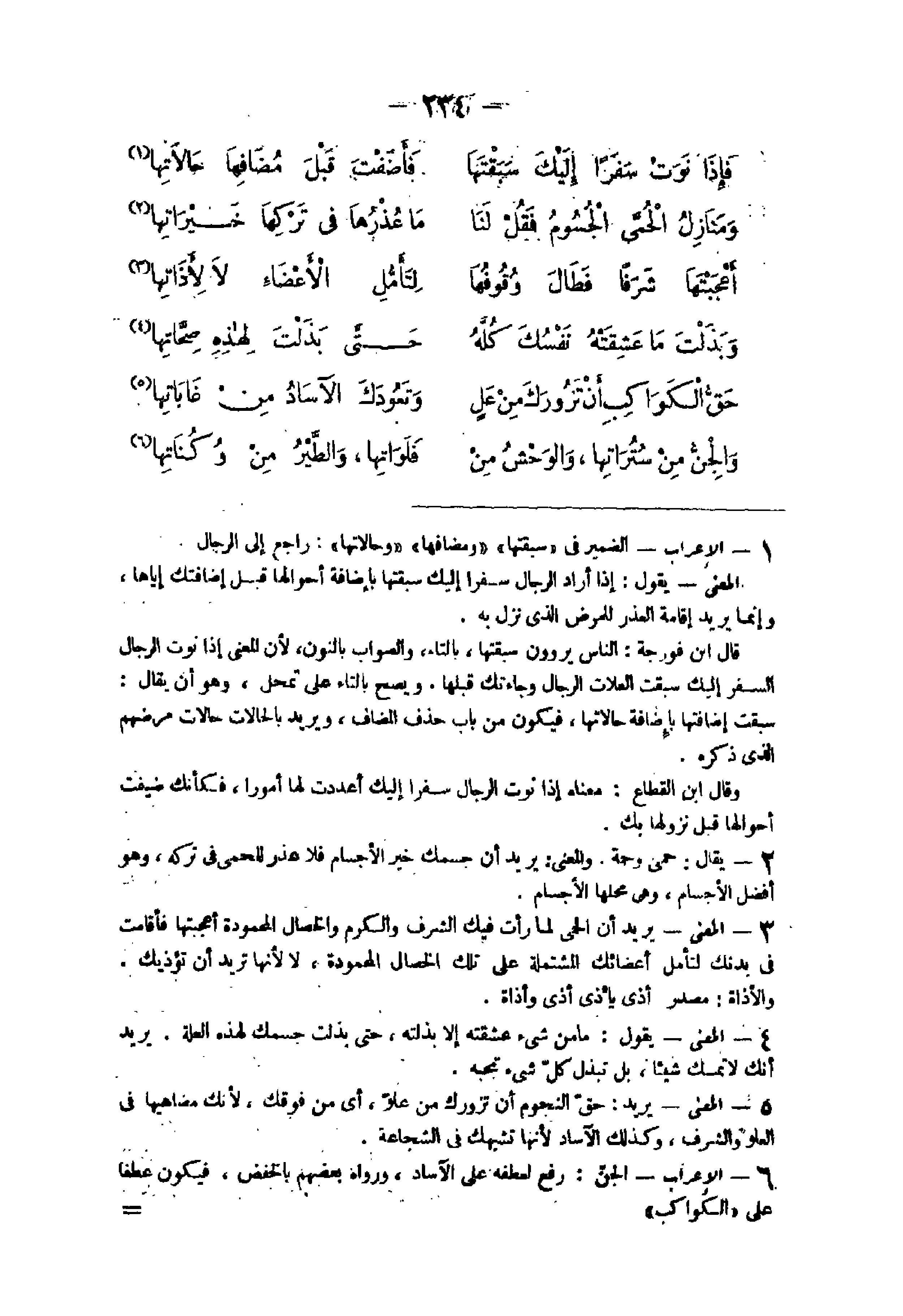 - الْإِعْرَاب الضَّمِير فى سبقتها ومضافها وحالاتها رَاجع إِلَى الرِّجَال الْمَعْنى يَقُول إِذا أَرَادَ الرِّجَال سفرا إِلَيْك سبقتها بِإِضَافَة أحوالها قبل إضافتك إِيَّاهَا وَإِنَّمَا يُرِيد إِقَامَة الْعذر للمرض الذى نزل بِهِ قَالَ ابْن فورجة النَّاس يروون سبقتها بِالتَّاءِ وَالصَّوَاب بالنُّون لِأَن الْمَعْنى إِذا نَوَت الرِّجَال السّفر إِلَيْك سبقت العلات الرِّجَال وجاءتك قبلهَا وَيصِح بِالتَّاءِ على تمحل وَهُوَ أَن يُقَال سبقت إضافتها بِإِضَافَة حالاتها فَيكون من بَاب حذف الْمُضَاف وَيُرِيد بالحالات حالات مرضهم الذى ذكره وَقَالَ ابْن القطاع مَعْنَاهُ إِذا نَوَت الرِّجَال سفرا إِلَيْك أَعدَدْت لَهَا أمورا فكأنك ضيقت أحوالها قبل نُزُولهَا بك