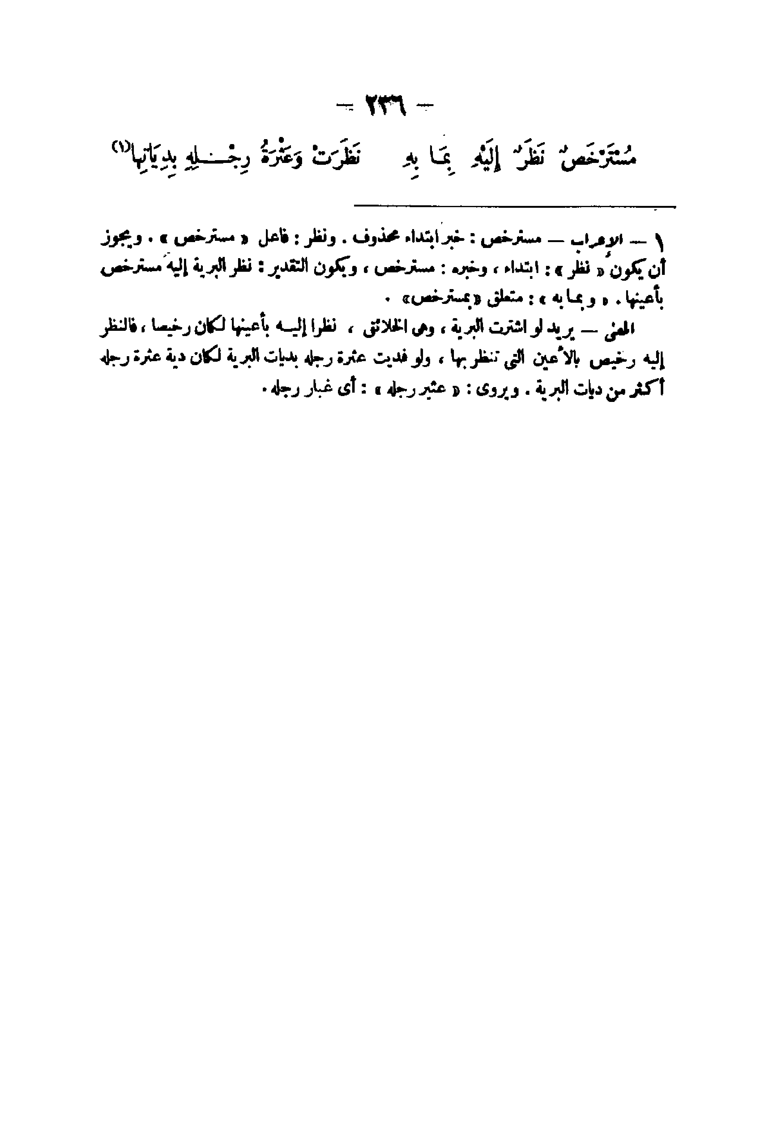 - الْإِعْرَاب مسترخص خبر ابْتِدَاء مَحْذُوف وَنظر فَاعل مسترخص وَيجوز أَن يكون نظر ابْتِدَاء وَخَبره مسترخص وَيكون التَّقْدِير نظر الْبَريَّة إِلَيْهِ مسترخص بأعينها وَبِمَا بِهِ مُتَعَلق بمسترخص الْمَعْنى يُرِيد لَو اشترت الْبَريَّة وهى الْخَلَائق نظرا إِلَيْهَا بأعينها لَكَانَ رخيصا فالنظر إِلَيْهِ رخيص بالأعين الَّتِى تنظر بهَا وَلَو فديت عَثْرَة رجله بديات الْبَريَّة لَكَانَ دِيَة عَثْرَة رجله أَكثر من ديات الْبَريَّة ويروى عثير رجله أى غُبَار رجله
