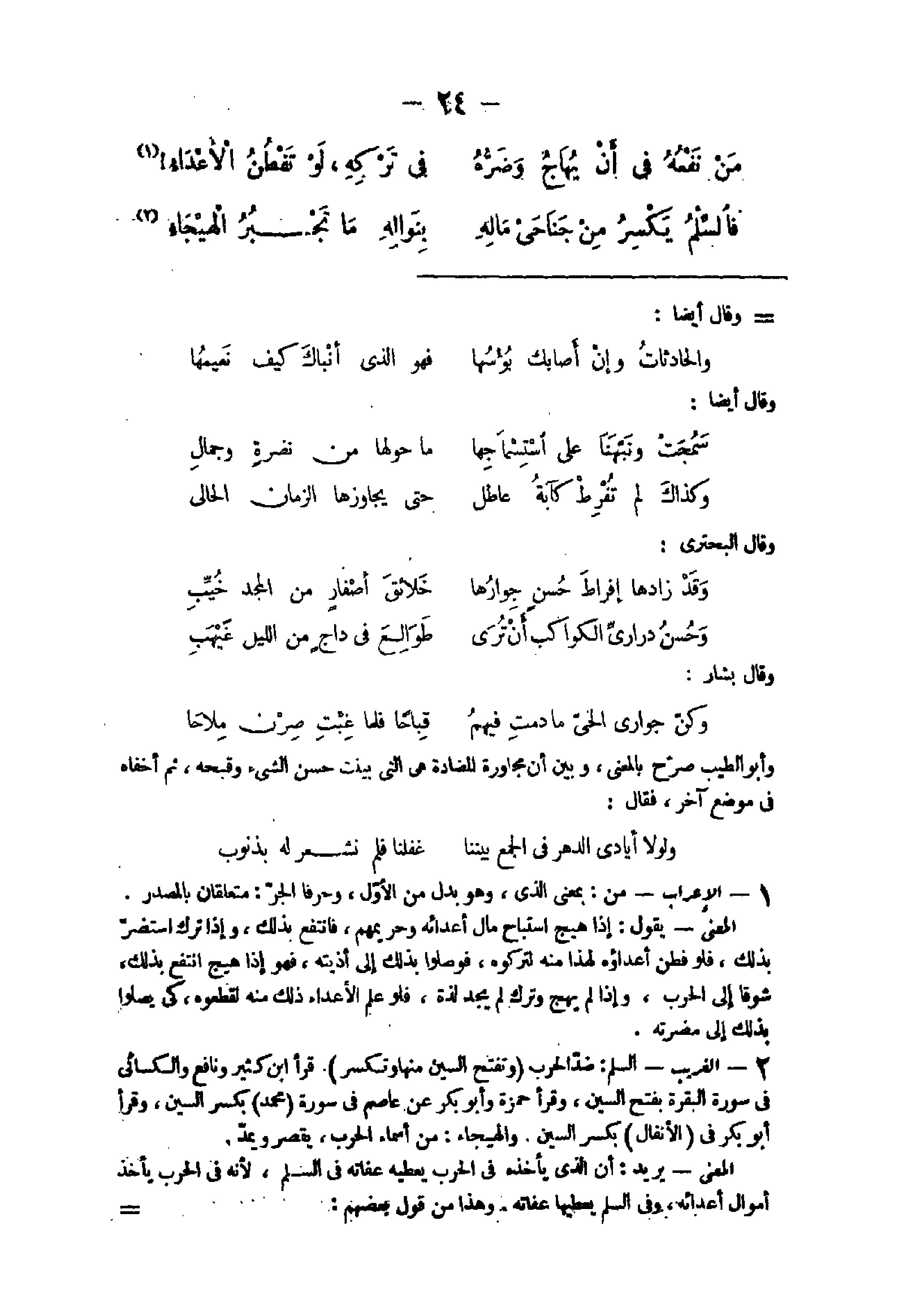 - الْإِعْرَاب من بِمَعْنى الذى وَهُوَ بدل من الأول وحرفا الْجَرّ متعلقان بِالْمَصْدَرِ الْمَعْنى يَقُول إِذا هيج استباح مَال أعدائه وحريمهم فَانْتَفع بذلك وَإِذا ترك استضر بذلك فَلَو فطن أعداؤه لهَذَا مِنْهُ لتركوه فوصولا بذلك إِلَى أذيته فَهُوَ إِذا هيج انْتفع بذلك شوقا إِلَى الْحَرْب وَإِذا لم يهج وَترك لم يجد لَذَّة فَلَو علم الْأَعْدَاء ذَلِك مِنْهُ لقطعوه كى يصلوا بذلك إِلَى مضرته