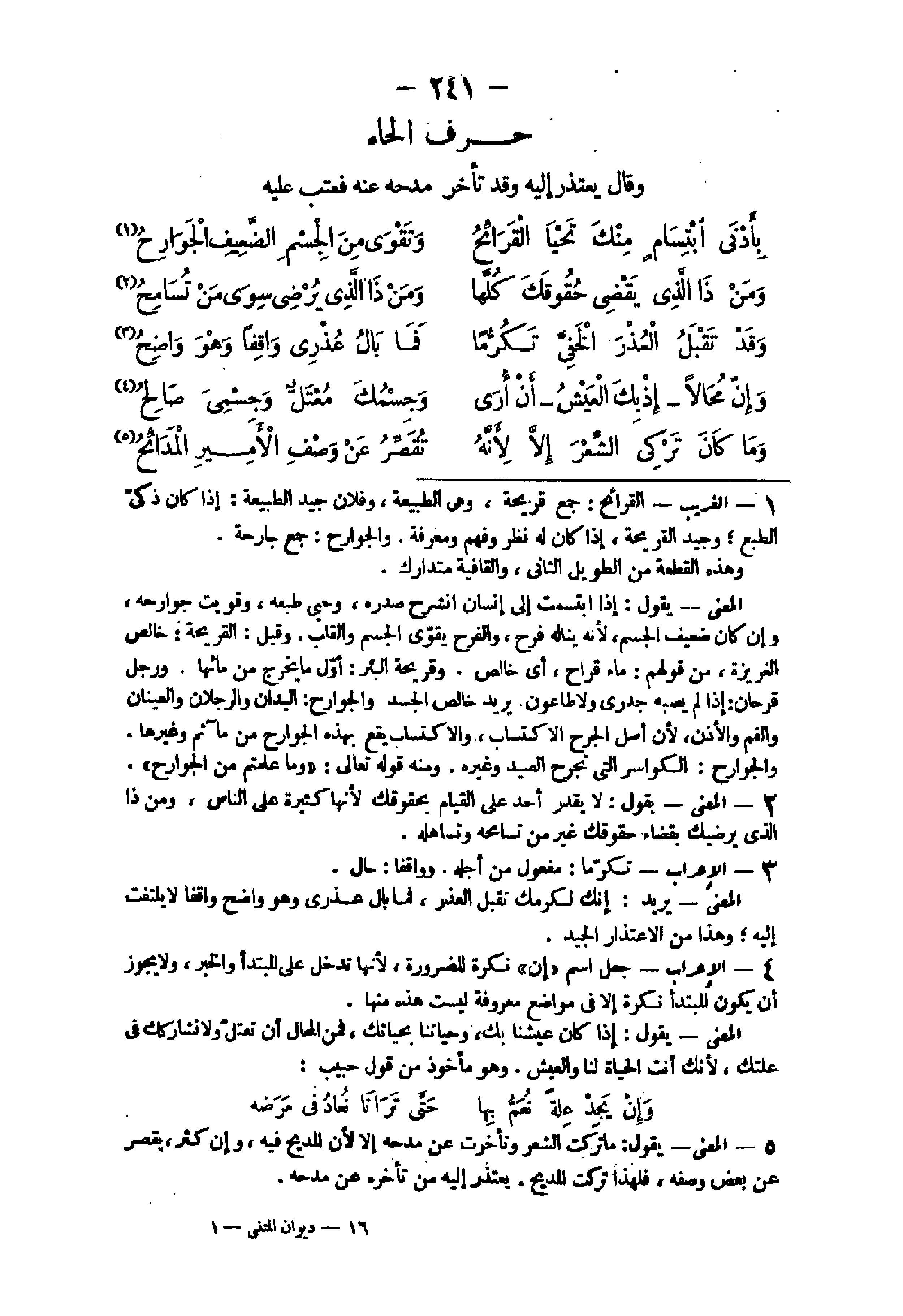 5 - الْمَعْنى يَقُول مَا تركت الشّعْر وتأخرت عَن مدحه إِلَّا لِأَن المديح فِيهِ وَإِن كثر يقصر عَن بعض وَصفه فَلهَذَا تركت المديح يعْتَذر إِلَيْهِ من تَأَخره عَن مدحه