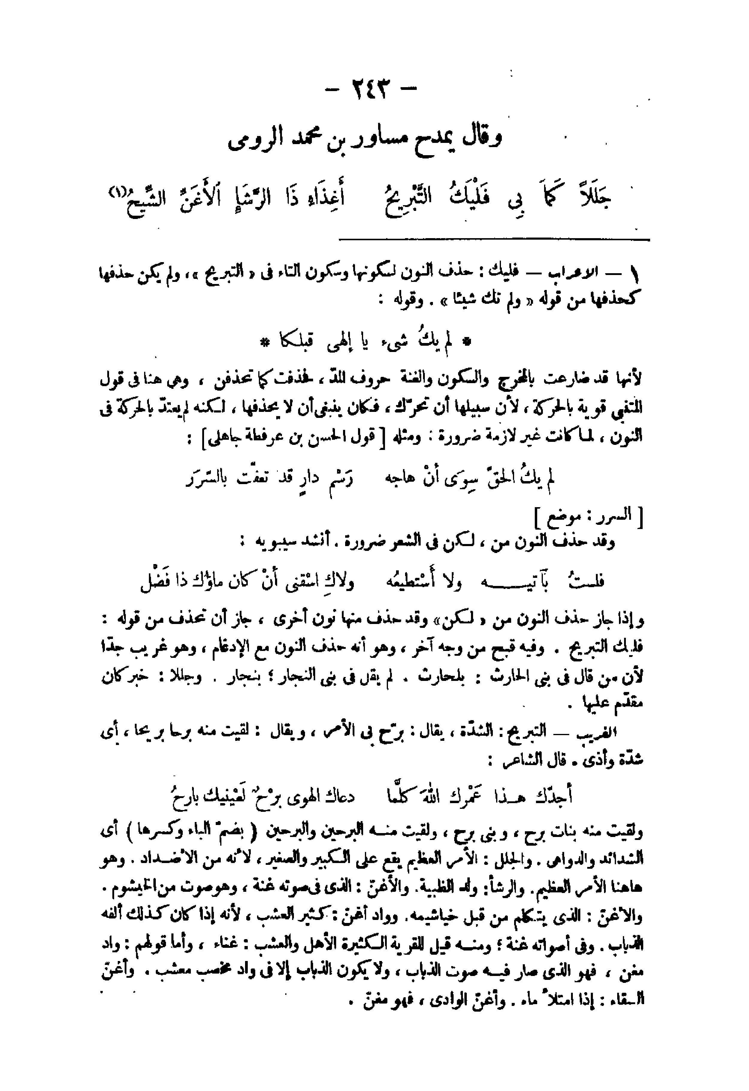 وَإِذا جَازَ حذف النُّون من لَكِن وَقد حذف مِنْهَا نون أُخْرَى جَازَ أَن تحذف من قَوْله فليك التبريح وَفِيه قبح من وَجه آخر وَهُوَ أَنه حذف النُّون مَعَ الْإِدْغَام وَهُوَ // غَرِيب جدا // لِأَن من قَالَ فى بنى الْحَارِث بلحارث لم يقل فى بنى النجار بنجار وجللا خبر كَانَ مقدم عَلَيْهَا الْغَرِيب التبريح الشدَّة يُقَال برح بى الْأَمر وَيُقَال لقِيت مِنْهُ برحا بريحا أى شدَّة وأذى قَالَ الشَّاعِر