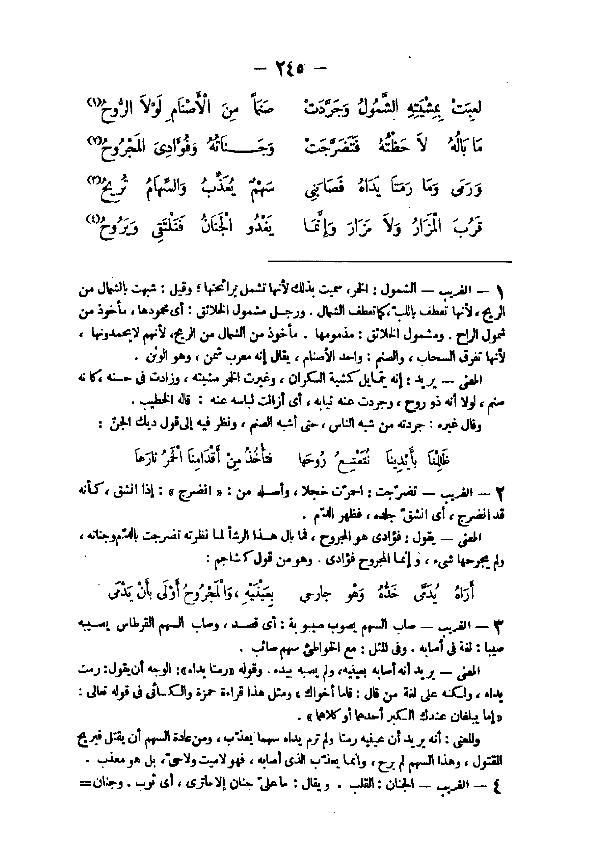 - الْغَرِيب الشُّمُول الْخمر سميت بذلك لِأَنَّهَا تَشْمَل برائحتها وَقيل شبهت بالشمال من الرّيح لِأَنَّهَا تعطف باللب كَمَا تعطف بالشمال وَرجل مشمول الْخَلَائق أى محمودها ومشمول الْخَلَائق مذمومها مَأْخُوذ من الشمَال من الرّيح لأَنهم لَا يحمدونهم لِأَنَّهَا تفرق السَّحَاب والصنم وَاحِد الْأَصْنَام يُقَال إِنَّه مُعرب شمن وَهُوَ الوثن الْمَعْنى يُرِيد إِنَّه يتمايل كمشية السَّكْرَان وغيرت الْخمر مشيته وزادت فى حسنه كَأَنَّهُ صنم لَوْلَا أَنه ذُو روح وجردت عَنهُ ثِيَابه أى أزالت لِبَاسه عَنهُ قَالَه الْخَطِيب وَقَالَ غَيره جردته من شبه النَّاس حَتَّى أشبه الصَّنَم وَنظر فِيهِ إِلَى قَول ديك الْجِنّ