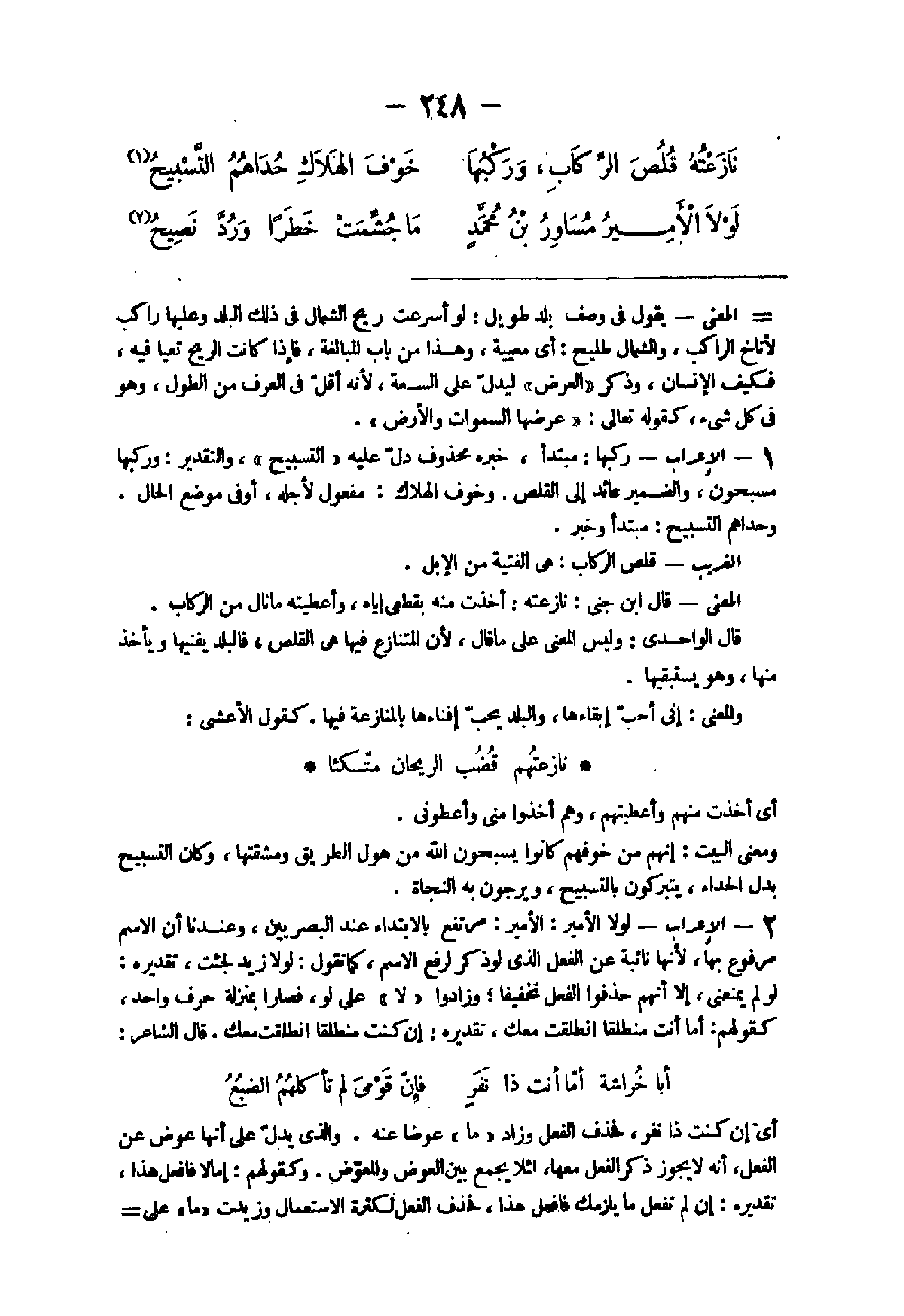 12 - الْإِعْرَاب ركبهَا مُبْتَدأ خَبره مَحْذُوف دلّ عَلَيْهِ التَّسْبِيح والثقدير وركبها مسبحون وَالضَّمِير عَائِد إِلَى القلص وَخَوف الْهَلَاك مفعول لأَجله أَو فى مَوضِع الْحَال وحداهم التَّسْبِيح مُبْتَدأ وَخبر الْغَرِيب قلص الركاب هى الْفتية من الْإِبِل الْمَعْنى قَالَ ابْن جنى نازعته أخذت مِنْهُ بقطعى إِيَّاه وأعطيته مَا نَالَ من الركاب قَالَ الواحدى وَلَيْسَ الْمَعْنى على مَا قَالَ لِأَن الْمُتَنَازع فِيهَا هى القلص فالبلد يفنيها وَيَأْخُذ مِنْهَا وَهُوَ يستبقيها وَالْمعْنَى إنى أحب إبقاءها والبلد يحب إفناءها بالمنازعة فِيهَا كَقَوْل الْأَعْشَى