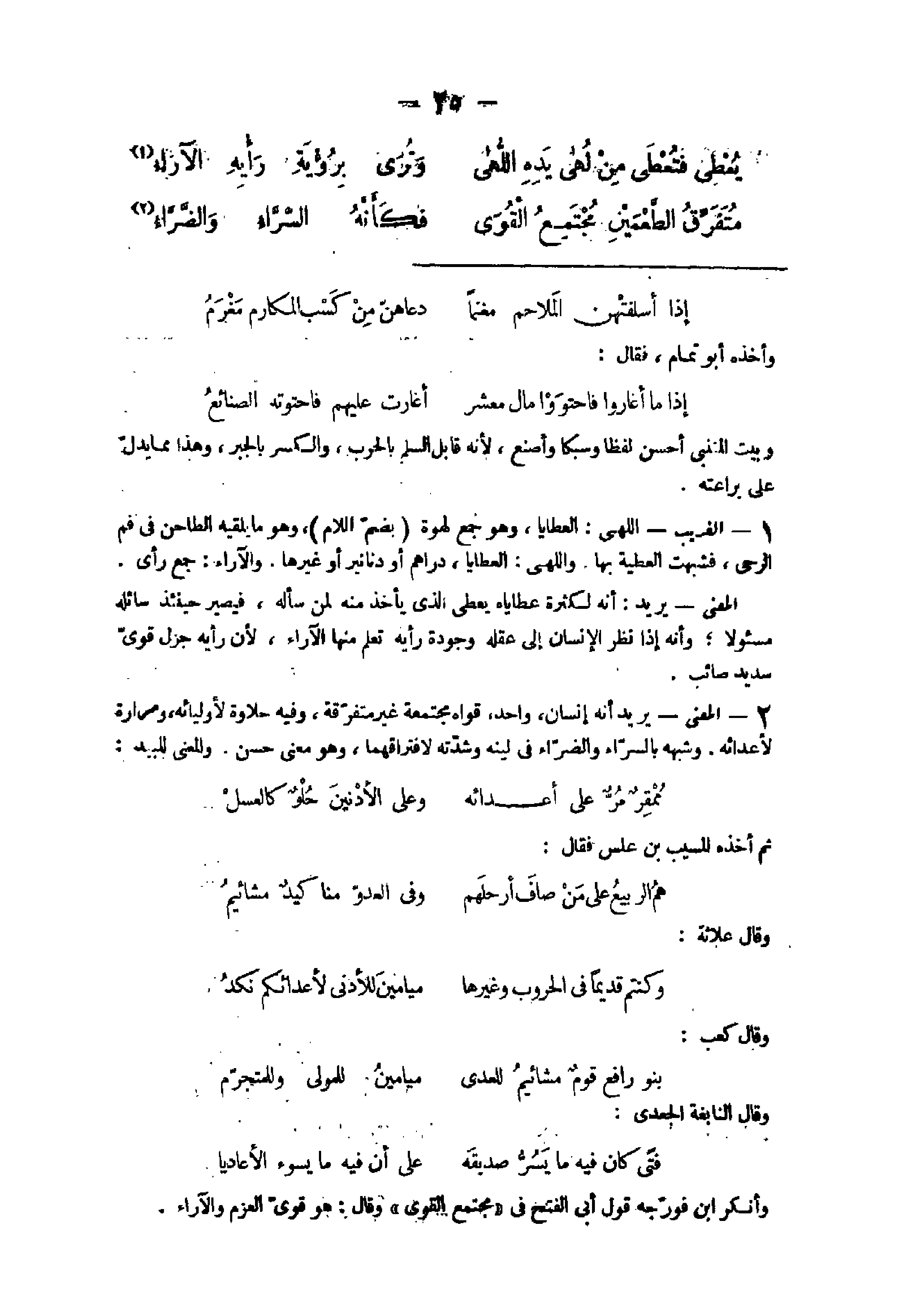 - الْغَرِيب اللهى العطايا وَهُوَ جمع لهوة بِضَم اللَّام وَهُوَ مَا يلقيه الطاحن فِي فَم الرَّحَى فشبهت الْعَطِيَّة بهَا واللهى العطايا دَرَاهِم أَو دَنَانِير أَو غَيرهَا والآراء جمع رأى الْمَعْنى يُرِيد أَنه لِكَثْرَة عطاياه يعْطى الذى يَأْخُذ مِنْهُ لمن سَأَلَهُ فَيصير حِينَئِذٍ سائله مسئولا وَأَنه إِذا نظر الْإِنْسَان إِلَى عقله وجودة رَأْيه تعلم مِنْهَا الآراء لِأَن رَأْيه جزل قوى سديد صائب