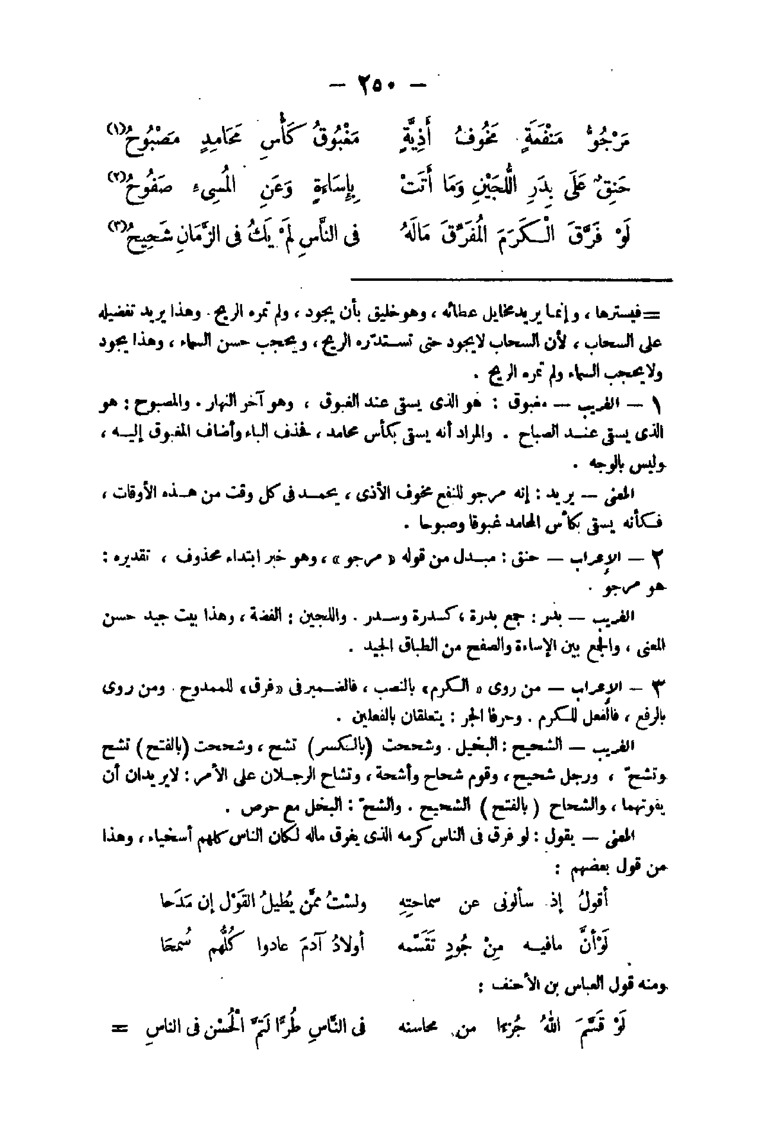 - الْغَرِيب مغبوق هُوَ الذى يسقى عِنْد الغبوق وَهُوَ آخر النَّهَار والمصبوح هُوَ الذى يسقى عِنْد الصَّباح وَالْمرَاد أَنه يسقى بكأس محامد فَحذف الْبَاء وأضاف المغبوق إِلَيْهِ وَلَيْسَ بِالْوَجْهِ الْمَعْنى يُرِيد إِنَّه مرجو للنفع مخوف الآذى يحمد فى كل وَقت من هَذِه الْأَوْقَات فَكَأَنَّهُ يسقى بكأس المحامد غبوقا وصبوحا
