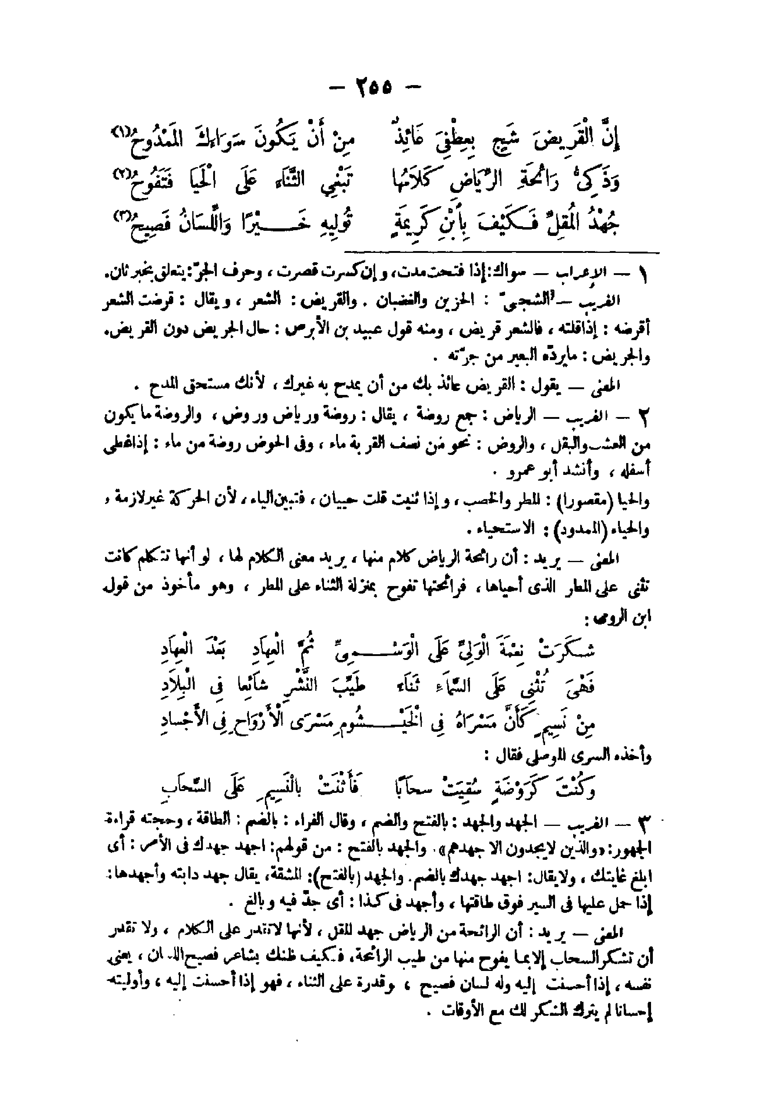 34 - الْغَرِيب الْجهد والجهد بِالْفَتْح وَالضَّم وَقَالَ الْفراء بِالضَّمِّ الطَّاقَة وحجته قِرَاءَة الْجُمْهُور وَالَّذين لَا يَجدونَ إِلَّا جهدهمْ والجهد بِالْفَتْح من قَوْلهم اجهد جهدك فى الْأَمر أى ابلغ غايتك وَلَا يُقَال اجهد جهدك بِالضَّمِّ والجهد بِالْفَتْح الْمَشَقَّة يُقَال جهد دَابَّته وأجهدها إِذا حمل عَلَيْهَا فى السّير فَوق طاقتها وأجهد فى كَذَا أى جد فِيهِ وَبَالغ الْمَعْنى يُرِيد أَن الرَّائِحَة من الرياض جهد الْمقل لِأَنَّهَا لَا تقدر على الْكَلَام وَلَا تقدر أَن تشكر السَّحَاب إِلَّا بِمَا يفوح مِنْهَا من طيب الرَّائِحَة فَكيف ظَنك بشاعر فصيح اللِّسَان يعْنى نَفسه إِذا أَحْسَنت إِلَيْهِ وَله لِسَان فصيح وقدرة على الثَّنَاء فَهُوَ إِذا أَحْسَنت إِلَيْهِ أَو أوليته إحسانا لم يتْرك الشُّكْر لَك مَعَ الْأَوْقَات