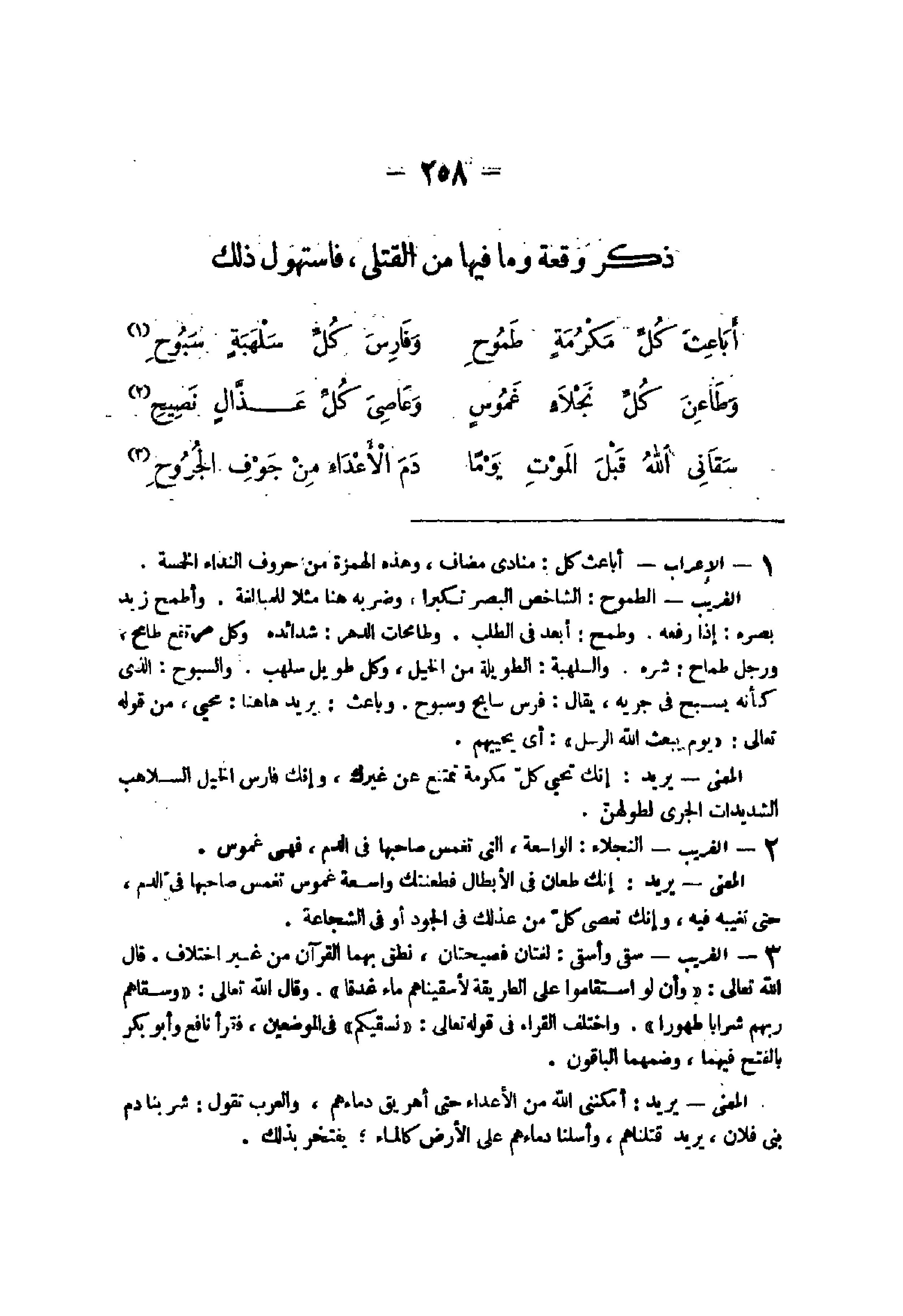 - 1 - الْإِعْرَاب أباعث كل منادى مُضَاف وَهَذِه الْهمزَة من حُرُوف النداء الْخَمْسَة الْغَرِيب الطموح الشاخص الْبَصَر تكبرا وضربه هُنَا مثلا للْمُبَالَغَة وأطمح زيد بَصَره إِذا رَفعه وطمح أبعد فى الطّلب وطامحات الدَّهْر شدائده وكل مُرْتَفع طامح وَرجل طماح شَره والسلهبة الطَّوِيلَة من الْخَيل وكل طَوِيل سلهب والسبوح الذى كَأَنَّهُ يسبح فى جريه يُقَال فرس سابح وسبوح وباعث يُرِيد هَا هُنَا محيى من قَوْله تَعَالَى {يَوْم يبْعَث الله الرُّسُل} أى يحييهم الْمَعْنى يُرِيد إِنَّك تحيى كل مكرمَة تمْتَنع عَن غَيْرك وَإنَّك فَارس الْخَيل السلاهب الشديدات الجرى لطولهن