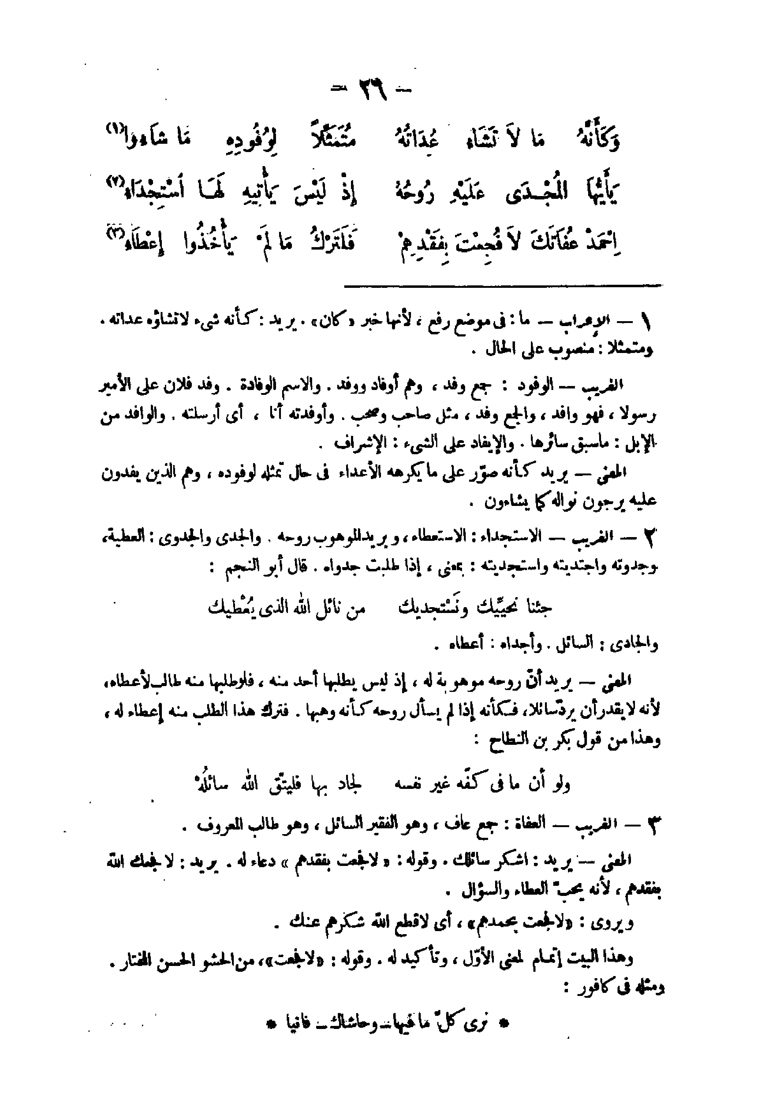 - الْإِعْرَاب مَا فِي مَوضِع رفع لِأَنَّهَا خبر كَأَن يُرِيد كَأَنَّهُ شئ لَا تشاؤه عداته ومتمثلا مَنْصُوب على الْحَال الْغَرِيب الْوُفُود جمع وَفد وهم أوفاد ووفد وَالِاسْم الْوِفَادَة وَفد فلَان على الْأَمِير رَسُولا فَهُوَ وَافد وَالْجمع وَفد مثل صَاحب وَصَحب وأوفته أَنا أى أَرْسلتهُ والوافد من الْإِبِل مَا سبق سائرها والإيفاد على الشئ الإشراف الْمَعْنى يُرِيد كَأَنَّهُ صور على مَا يكرههُ الْأَعْدَاء فِي حَال تمثله لوفوده وهم الَّذِي يفدون عَلَيْهِ يرجون نواله كَمَا يشاءون