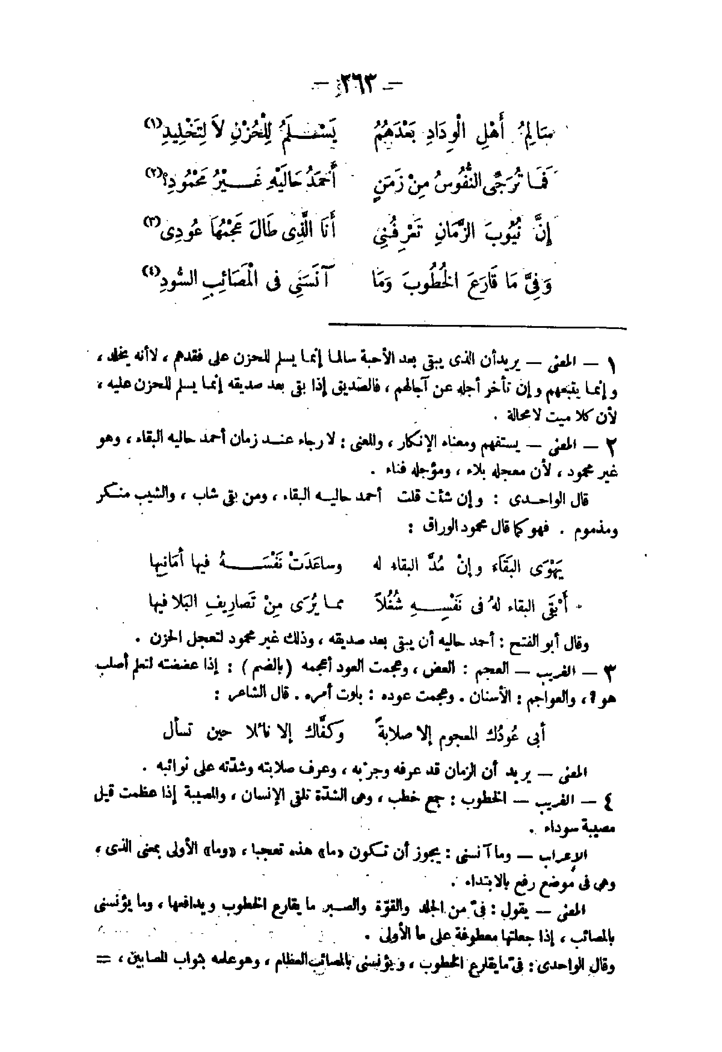 - الْمَعْنى يُرِيد أَن الذى يبْقى بعد الْأَحِبَّة سالما إِنَّمَا يسلم للحزن على فقدهم لَا أَنه يخلد وَإِنَّمَا يتبعهُم وَإِن تَأَخّر أَجله عَن آجالهم فالصديق إِذا بقى بعد صديقه إِنَّمَا يسلم للحزن عَلَيْهِ لِأَن كلا ميت لَا محَالة