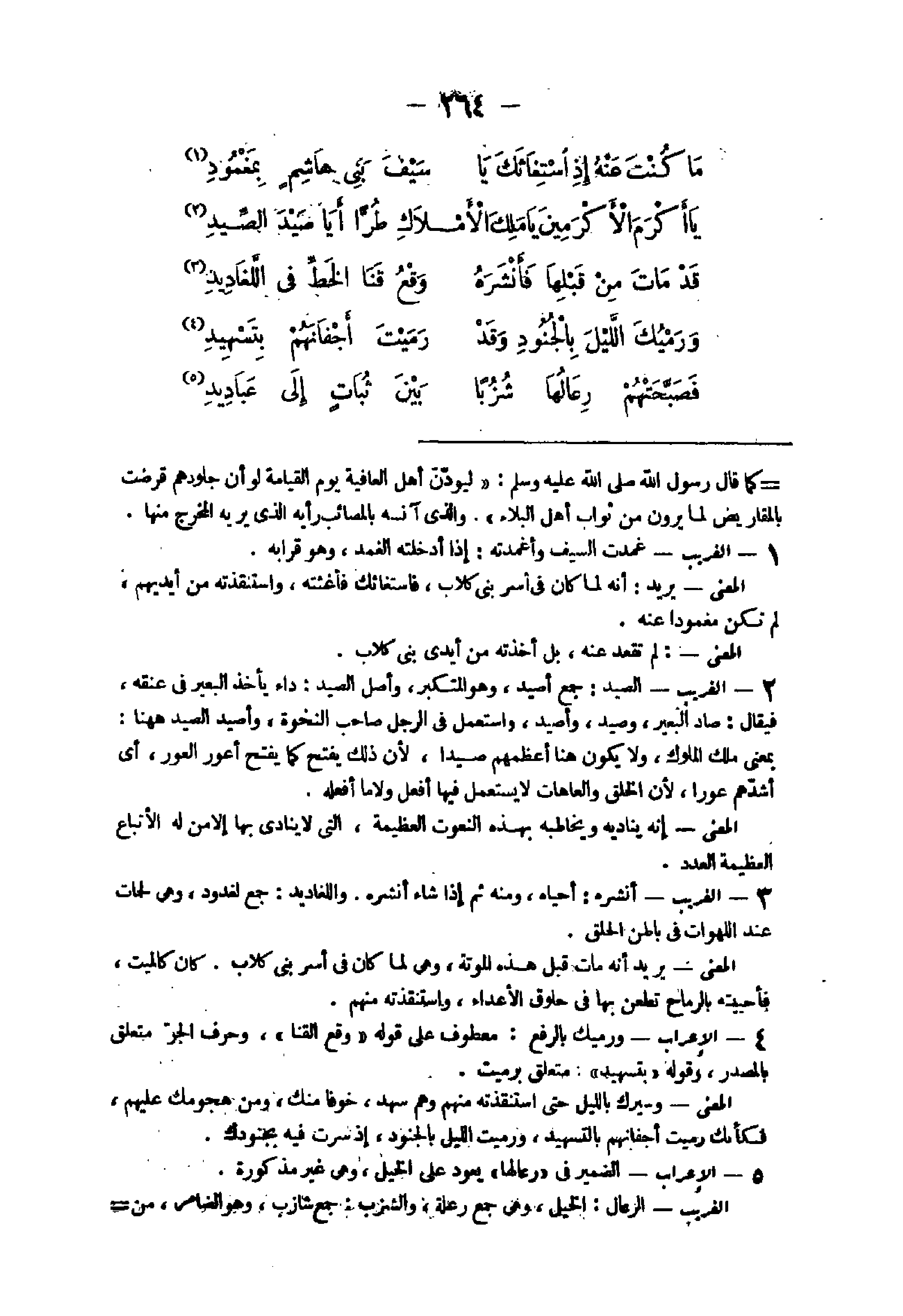 14 - الْغَرِيب الصَّيْد جمع أصيد وَهُوَ المتكبر وأصل الصَّيْد دَاء يَأْخُذ الْبَعِير فى عُنُقه فَيُقَال صَاد الْبَعِير وصيد وأصيد وَاسْتعْمل فى الرجل صَاحب النخوة وأصيد الصَّيْد هُنَا بِمَعْنى ملك الْمُلُوك وَلَا يكون هُنَا أعظمهم صيدا لِأَن ذَلِك يفتح كَمَا يفتح أَعور العور أى أَشَّدهم عورا لِأَن الْخلق والعاهات لَا يسْتَعْمل فِيهَا أفعل وَلَا مَا أَفعلهُ الْمَعْنى إِنَّه يُنَادِيه ويخاطبه بِهَذِهِ النعوت الْعَظِيمَة الَّتِى لَا يُنَادى بهَا إِلَّا من لَهُ الأتباع الْعَظِيمَة الْعدَد