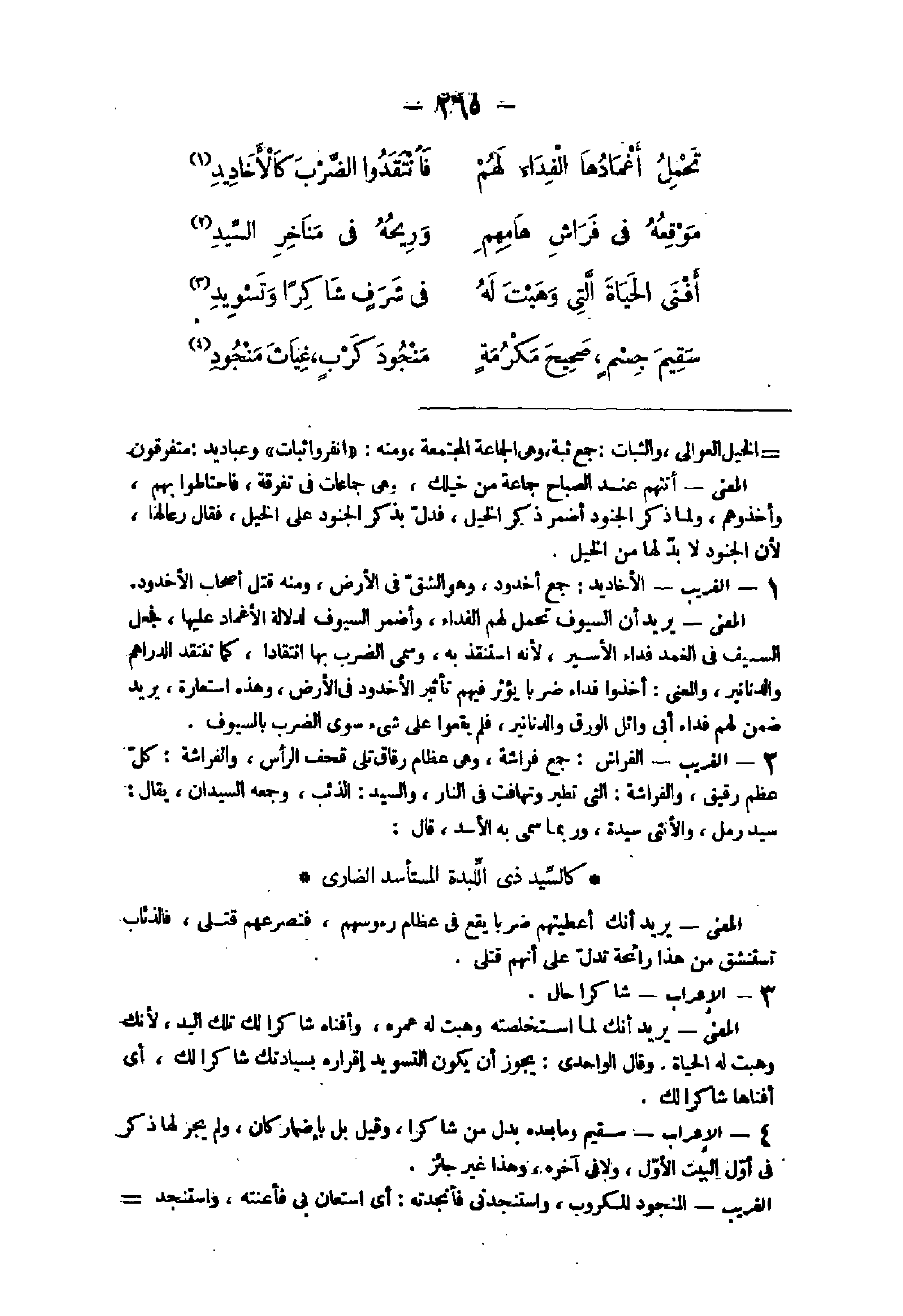 الْمَعْنى يُرِيد أَن السيوف تحمل لَهُم الْفِدَاء وأضمر السيوف لدلَالَة الأغماد عَلَيْهَا فَجعل السَّيْف فى الغمد فدَاء الْأَسير لِأَنَّهُ استنقذ بِهِ وسمى الضَّرْب بهَا انتقادا كَمَا تنتقد الدَّرَاهِم وَالدَّنَانِير وَالْمعْنَى أخذُوا فدَاء ضربا يُؤثر فيهم تَأْثِير الْأُخْدُود فى الأَرْض وَهَذِه اسْتِعَارَة يُرِيد ضمن لَهُم فدَاء أَبى وَائِل الْوَرق وَالدَّنَانِير فَلم يقعوا على شئ سوى الضَّرْب بِالسُّيُوفِ