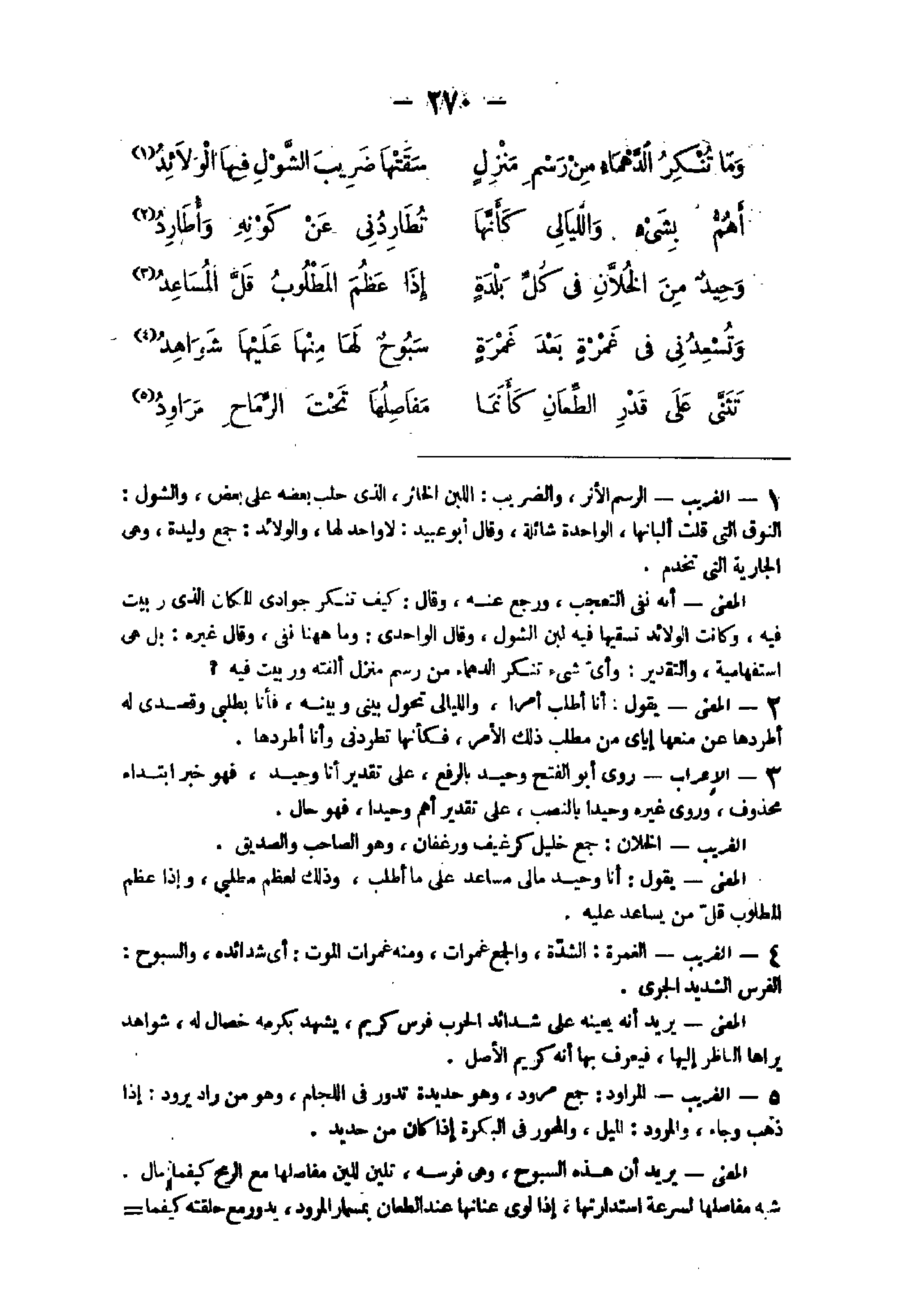 - الْغَرِيب الرَّسْم الْأَثر والضريب اللَّبن الخائر الذى حلب بعضه على بعض والشول النوق الَّتِى قلت أَلْبَانهَا الْوَاحِدَة شَائِلَة وَقَالَ أَبُو عبيد لَا وَاحِد لَهَا والولائد جمع وليدة وهى الْجَارِيَة الَّتِى تخْدم الْمَعْنى أَنه نفى التَّعَجُّب وَرجع عَنهُ وَقَالَ كَيفَ تنكر جوادى الْمَكَان الذى ربيت فِيهِ وَكَانَت الولائد تسقيها فِيهِ لبن الشول وَقَالَ الواحدى وَمَا هَهُنَا نفى وَقَالَ غَيره بل هى استفهامية وَالتَّقْدِير وأى شئ تنكر الدهماء من رسم منزل ألفته وربيت فِيهِ