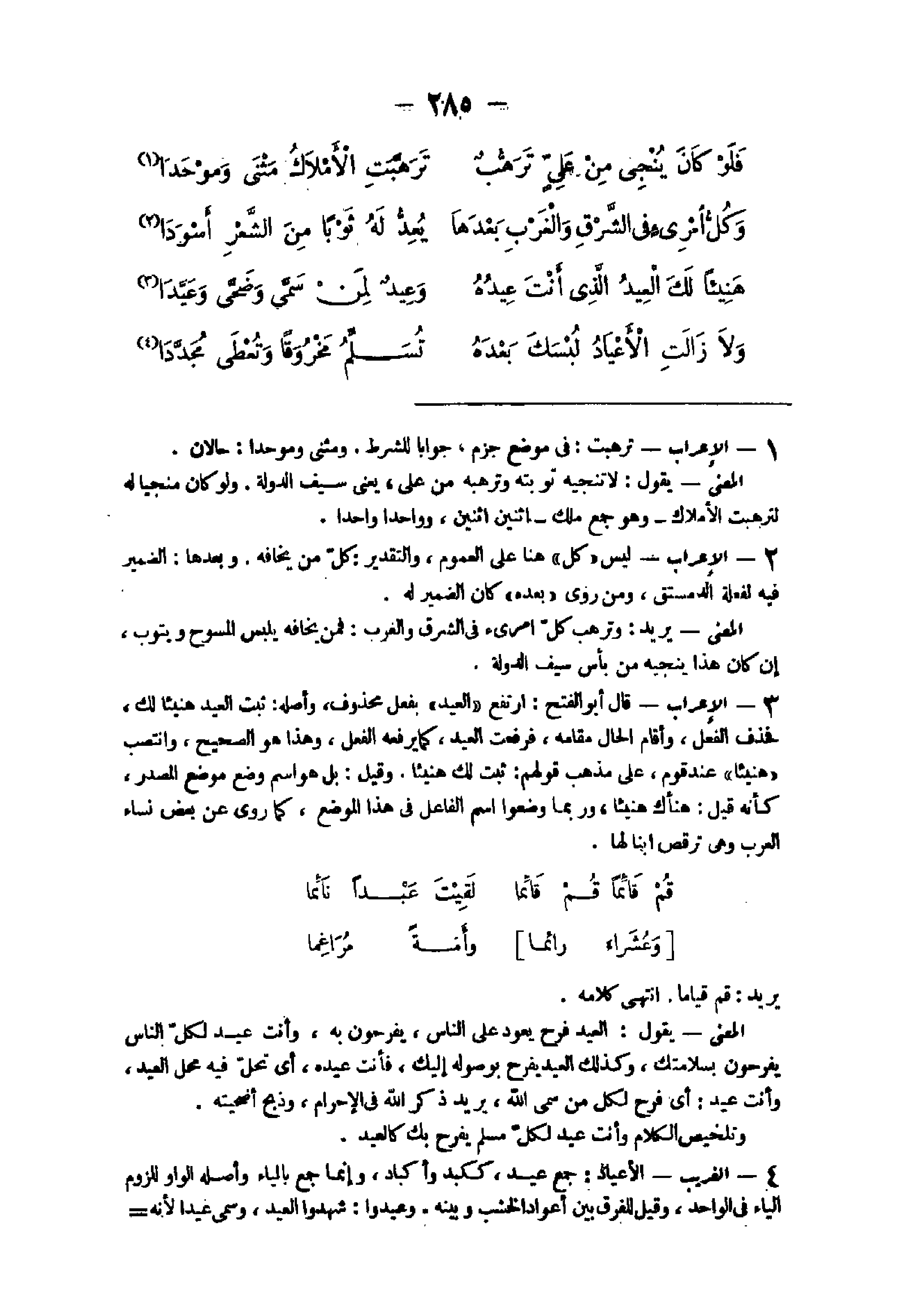 25 - الْإِعْرَاب الدائل اسْم فَاعل من دَال يدول وَيُرِيد بِهِ هُنَا صَاحب الدولة أخرجه مخرج لِابْنِ وتامر وشفرتا السَّيْف حداه الْمَعْنى يتعجب من عَظِيم همة الدولة إِذْ تقلدته والدولة فى الْحَقِيقَة الْخَلِيفَة وفى هَذَا تَفْضِيل لَهُ على الْخَلِيفَة بِالْقُوَّةِ وَضرب لهَذَا مثلا قَالَ ابْن القطاع صحف هَذَا الْبَيْت فروى دائل بِالدَّال الْمُهْملَة من الدولة وَلَا معنى للدولة فِيهِ وَالصَّحِيح بِالذَّالِ الْمُعْجَمَة وَهُوَ الرجل المتقلد سَيْفه المتبختر فى مشيته والذائل السَّيْف الطَّوِيل أَيْضا وَكَذَلِكَ الْفرس الطَّوِيل الذَّنب فَإِن كَانَ قَصِيرا وذنبه طَوِيل قيل ذَيَّال الذَّنب الدرْع الطَّوِيلَة قَالَ النَّابِغَة
