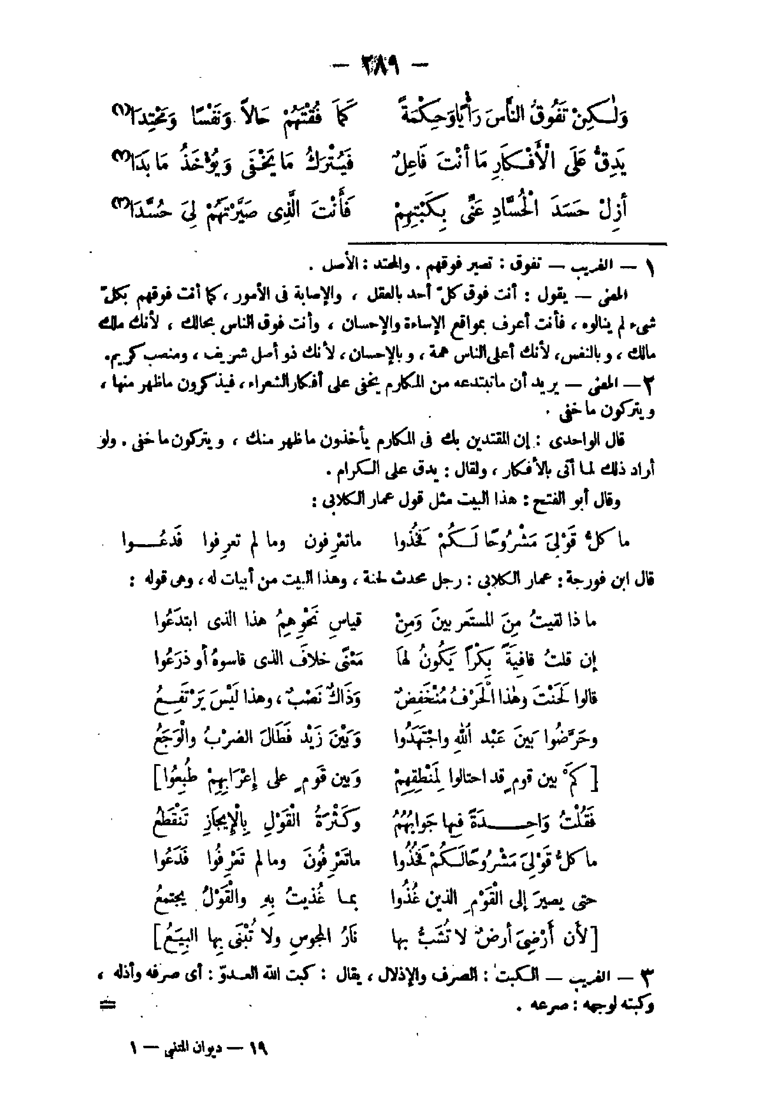 - الْغَرِيب تفوق تصير فَوْقهم والمحتد الأَصْل الْمَعْنى يَقُول أَنْت فَوق كل أحد بِالْعقلِ والإصابة فى الْأُمُور كَمَا أَنْت فَوْقهم بِكُل شئ لم ينالوه فَأَنت أعرف بمواقع الْإِسَاءَة وَالْإِحْسَان وَأَنت فَوق النَّاس بحالك لِأَنَّك ملك مَالك وبالنفس لِأَنَّك أَعلَى النَّاس همة وبالإحسان لِأَنَّك ذُو أصل شرِيف ومنصب كريم
