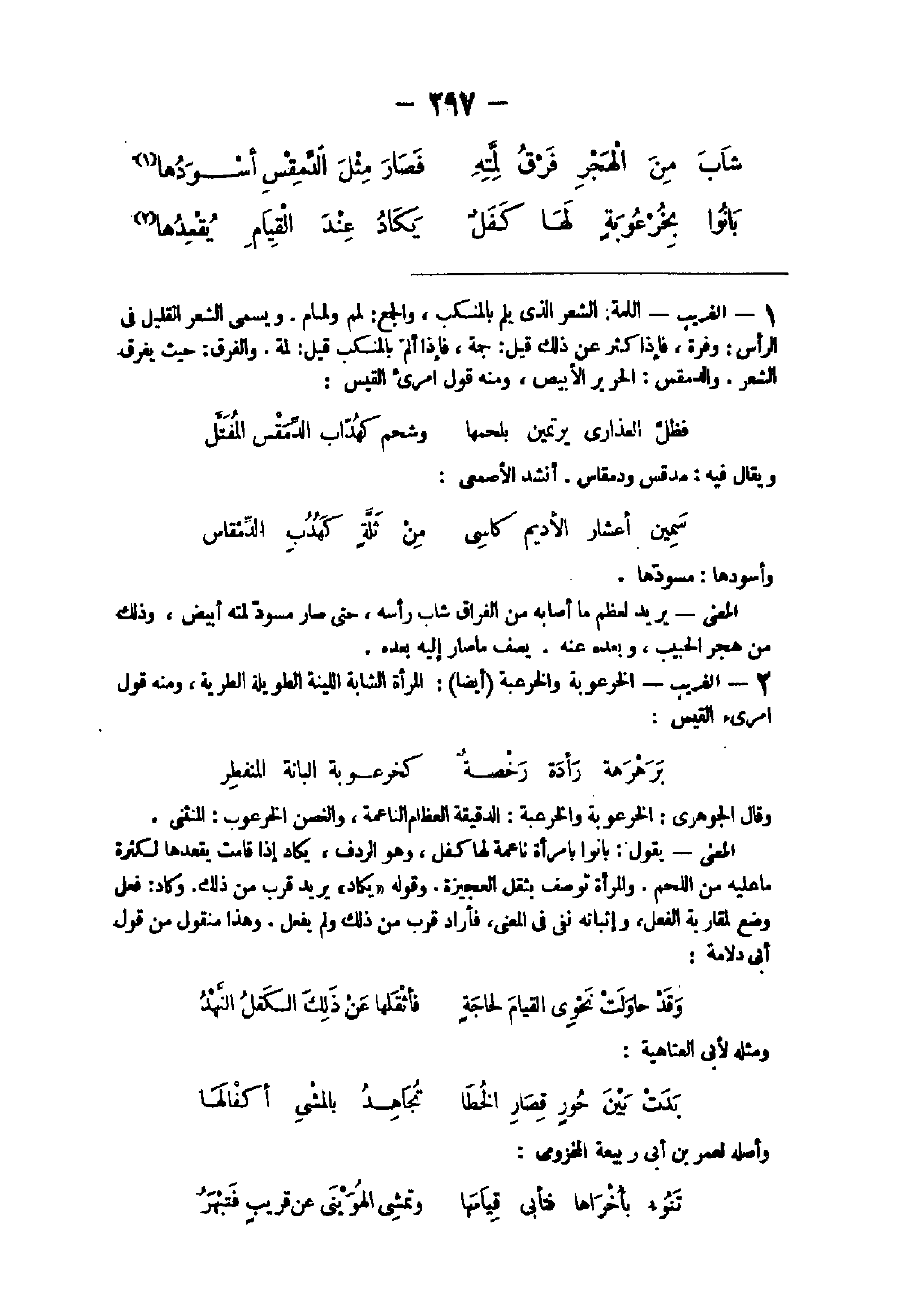وأسودها مسودها الْمَعْنى يُرِيد لعظم مَا أَصَابَهُ من الْفِرَاق شَاب رَأسه حَتَّى صَار مسود لمته أَبيض وَذَلِكَ من هجر الحبيب وَبعده عَنهُ يصف مَا صَار إِلَيْهِ بعده 7 - الْغَرِيب الخرعوبة والخرعبة أَيْضا الْمَرْأَة الشَّابَّة اللينة الطَّوِيلَة الطرية وَمِنْه قَول امْرِئ الْقَيْس
