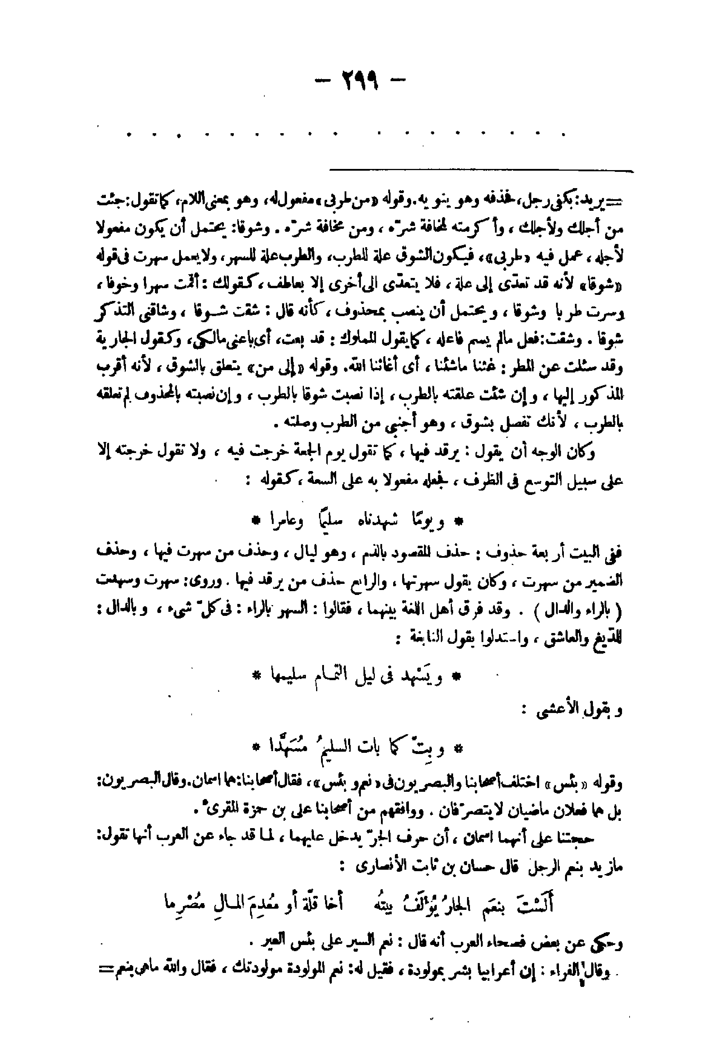 يُرِيد بكفى رجل فَحَذفهُ وَهُوَ بنويه وَقَوله من طربى مفعول لَهُ وَهُوَ بِمَعْنى اللَّام كَمَا تَقول جِئْت من أَجلك ولأجلك وأكرمته لمخافة شَره وَمن مَخَافَة شَره وشوقا يحْتَمل أَن يكون مَفْعُولا لأَجله عمل فِيهِ طربى فَيكون الشوق عِلّة للطرب والطرب عِلّة للسهر وَلَا يعْمل سهرت فى قَوْله شوقا لانه قد تعدى إِلَى عِلّة فَلَا يتَعَدَّى إِلَى أُخْرَى إِلَّا بعاطف كَقَوْلِك أَقمت سهرا وخوفا وسرت طَربا وشوقا وَيحْتَمل أَن ينصب بِمَحْذُوف كَأَنَّهُ قَالَ شقَّتْ شوقا وشاقنى التَّذَكُّر شوقا وَشقت فعل مَا لم بِسم فَاعله كَمَا يَقُول الْمَمْلُوك قد بِعْت أى باعنى مالكى وكقول الْجَارِيَة وَقد سُئِلت عَن الْمَطَر غثنا مَا شِئْنَا أى أغاثنا الله وَقَوله إِلَى الله وَقَوله إِلَى من يتَعَلَّق بالشوق لِأَنَّهُ أقرب الْمَذْكُور إِلَيْهَا وَإِن شِئْت علقته بالطرب إِذا نصبت شوقا بالطرب وَإِن نصبته بالمحذوف لم تعلقه بالطرب لِأَنَّك تفصل بشوق وَهُوَ أجنبى من الطَّرب وصلته وَكَانَ الْوَجْه أَن يَقُول يرقد فِيهَا كَمَا تَقول يَوْم الْجُمُعَة خرجت فِيهِ وَلَا تَقول خرجته إِلَّا على سَبِيل التَّوَسُّع فى الظّرْف فَجعله مَفْعُولا بِهِ على السعَة كَقَوْلِه