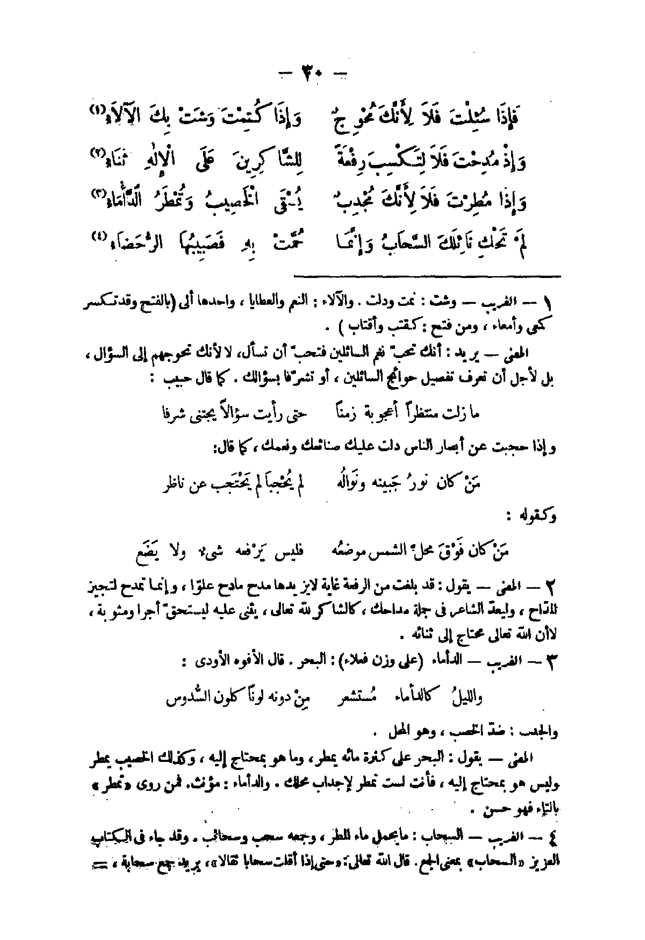 43 - الْغَرِيب السَّحَاب مَا يحمل مَاء الْمَطَر وَجمعه سحب وسحائب وَقد جَاءَ فِي الْكتاب الْعَزِيز السَّحَاب بِمَعْنى الْجمع قَالَ الله تَعَالَى {حَتَّى إِذا أقلت سحابا ثقالا} يُرِيد جمع سَحَابَة الضَّمِير فى قَوْله سقناه رَاجع إِلَى مَاء السَّحَاب أَو إِلَى الْقطر والمطر وَإِن كَانَا غير مذكورين وَكَقَوْلِه تَعَالَى {فأثرن بِهِ نقعا} يُرِيد بِهِ الوادى وَلم يجر لَهُ ذكر والرحضاء عرق الْحمى الْمَعْنى يَقُول السحابة لم تحك نائلك لِأَنَّهَا لَا تقدر على ذَلِك لِكَثْرَة عطائك المتتابع فَإِنَّهُ أَكثر من مَائِهَا وَإِنَّمَا هُوَ عرق حماها لحسدها لَك فأورثها الْحمى فَمَا ترى من مَائِهَا فَإِنَّهَا لَو عرق حماها حسدا لَك فالذى ينصب من مطرها هُوَ من عرق حماها وَهُوَ أبلغ من قَول أَبى نواس