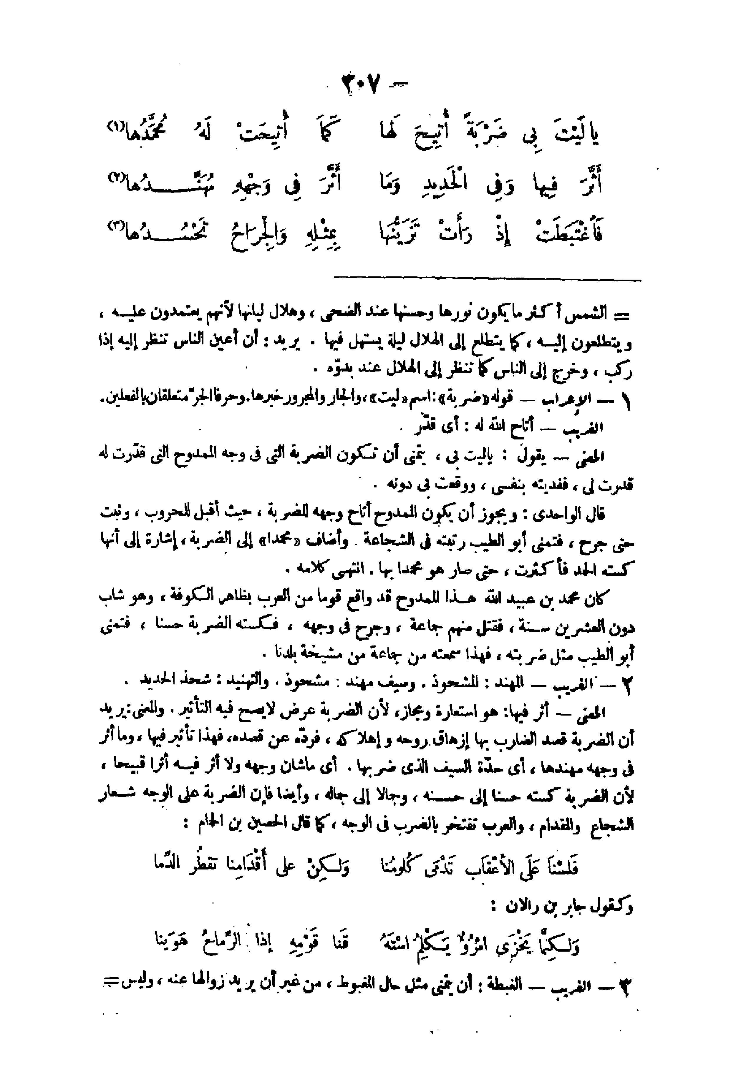 - الْإِعْرَاب قَوْله ضَرْبَة اسْم لَيْت وَالْمَجْرُور خَبَرهَا وحرفا الْجَرّ متعلقان بالفعلين الْغَرِيب أتاح الله لَهُ أى قدر الْمَعْنى يَقُول يَا لَيْت بى يتَمَنَّى أَن تكون الضَّرْبَة الَّتِى فى وَجه الممدوح الَّتِى قدرت لَهُ قدرت لى ففديته بنفسى وَوَقعت بى دونه قَالَ الواحدى وَيجوز أَن يكون الممدوح أتاح وَجهه للضربة حَيْثُ أقبل للحروب وَثَبت حَتَّى جرح فتمنى أَبُو الطّيب رتبته فى الشجَاعَة وأضاف مُحَمَّدًا إِلَى الضَّرْبَة إِشَارَة إِلَى أَنَّهَا كسته الْحَمد فَأَكْثَرت حَتَّى صَار هُوَ مُحَمَّدًا بهَا انْتهى كَلَامه كَانَ مُحَمَّد بن عبيد الله هَذَا الممدوح قد وَاقع قوما من الْعَرَب بِظَاهِر الْكُوفَة وَهُوَ شَاب دون الْعشْرين سنة فَقتل مِنْهُم جمَاعَة وجرح فى وَجهه فكسته الضَّرْبَة حسنا فتمنى أَبُو الطّيب مثل ضَربته فَهَذَا سمعته من جمَاعَة من مشيخة بلدنا