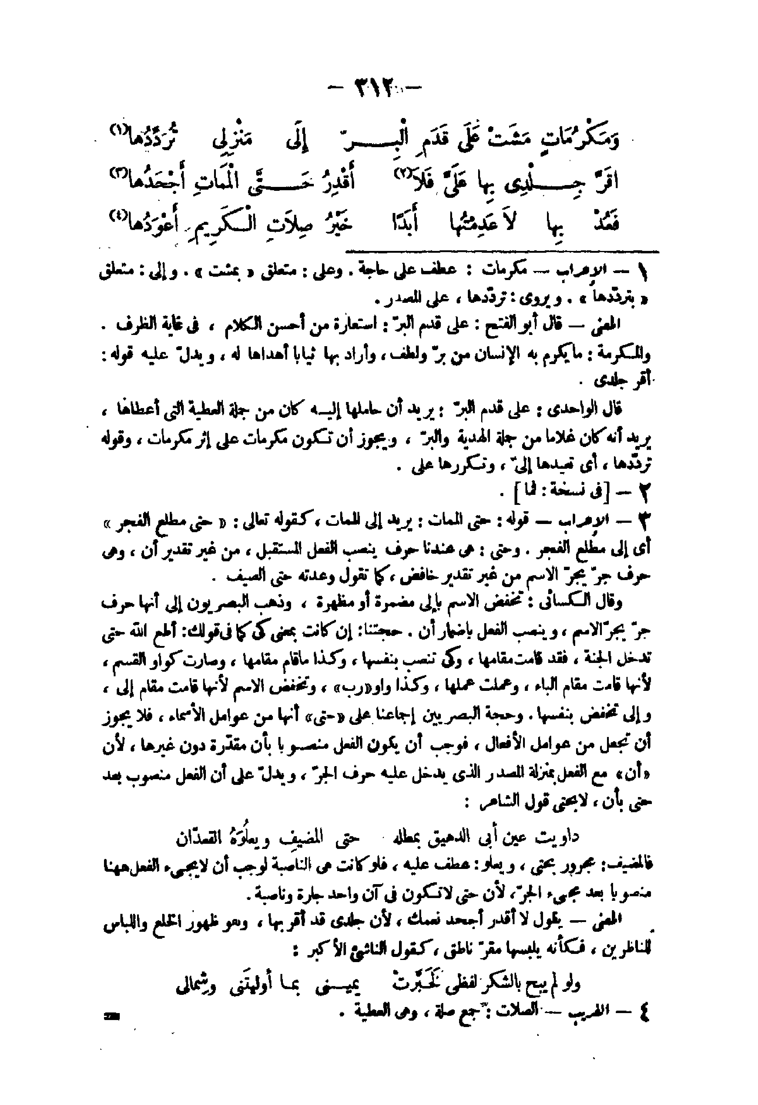 - الْإِعْرَاب مكرمات عطف على حَاجَة وعَلى مُتَعَلق بمشت وَإِلَى مُتَعَلق بترددها ويروى ترددها على الْمصدر الْمَعْنى قَالَ أَبُو الْفَتْح على قدم الْبر اسْتِعَارَة من أحسن الْكَلَام فى غَايَة الظّرْف والمكرمة مَا يكرم بِهِ الْإِنْسَان من بر ولطف وَأَرَادَ بهَا ثيابًا أهداها لَهُ وَيدل عَلَيْهِ قَوْله أقرّ جلدى قَالَ الواحدى على قدم الْبر يُرِيد أَن حاملها إِلَيْهِ كَانَ من جملَة الْعَطِيَّة الَّتِى أَعْطَاهَا يُرِيد أَنه كَانَ غُلَاما من جملَة الْهَدِيَّة وَالْبر وَيجوز أَن تكون مكرمات على إِثْر مكرمات وَقَوله ترددها أى تعيدها إِلَى وتكررها على